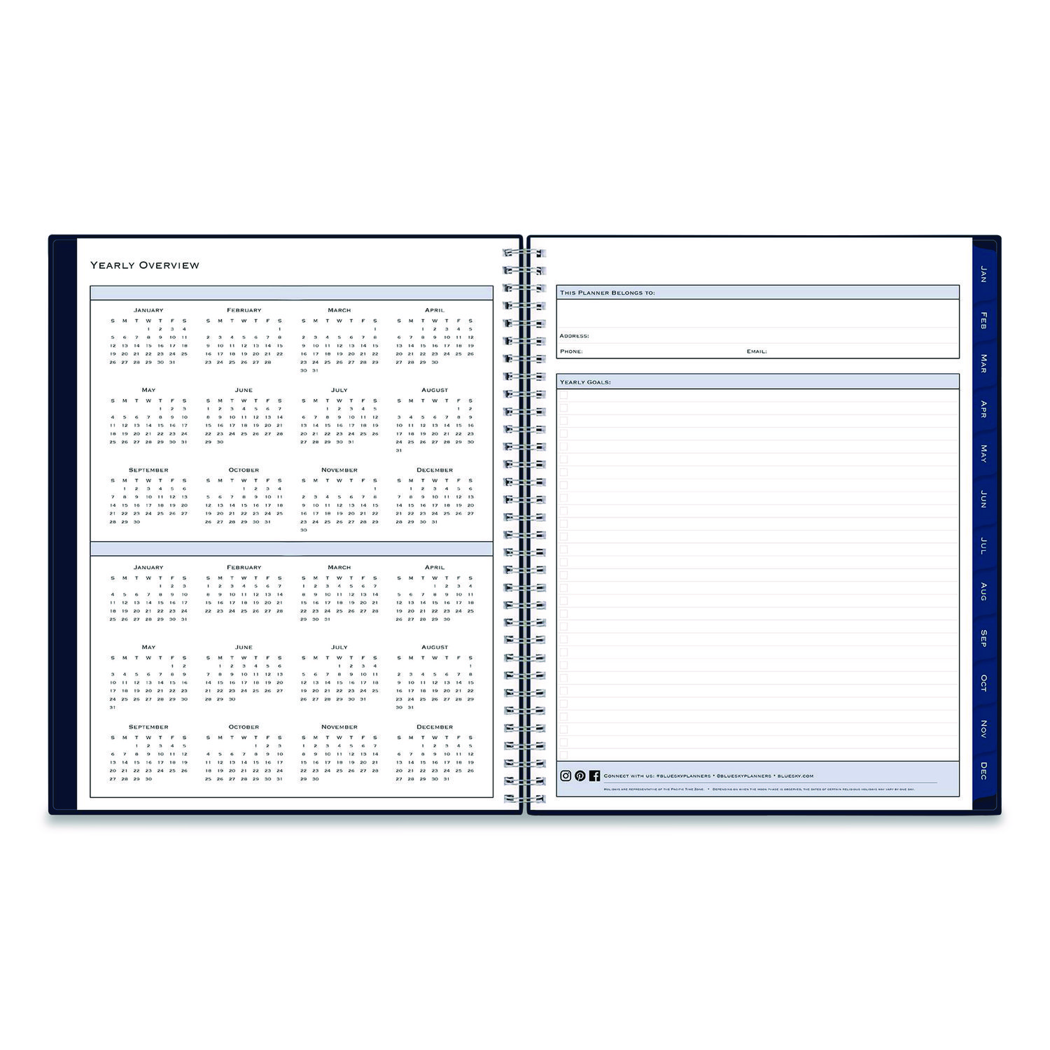 | Separate Sections: | (6) Bonus Past Monthly Spreads (July-Dec); Contacts; Important Dates List; Ruled Notes Pages; States & Capitals Map; Two-Year Holidays List; Two-Year Reference Calendar; Yearly Goals |
