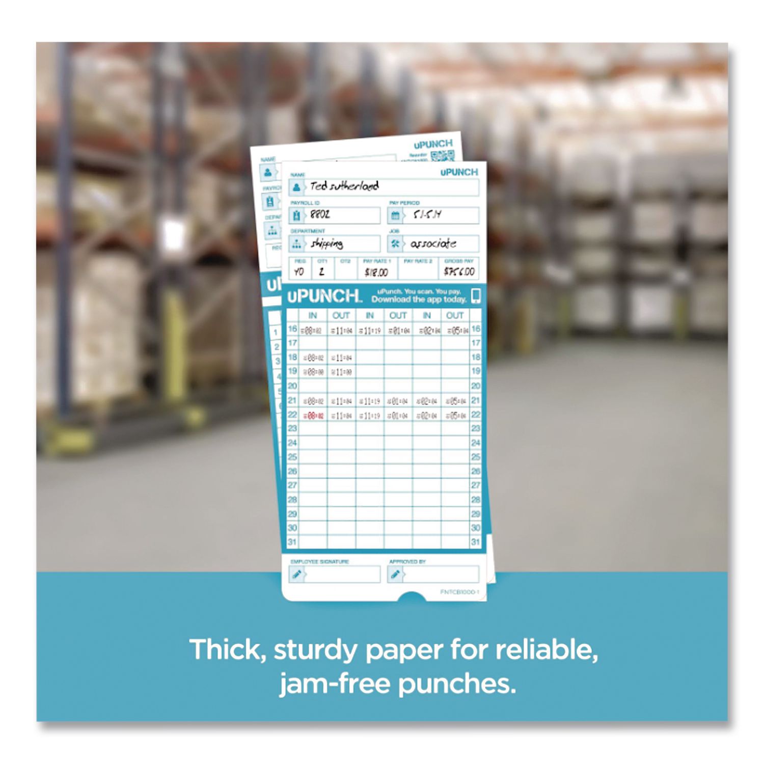 This double-sided time card is compatible with the uPunch™ Pay-to-Punch mobile app and supports weekly, biweekly, semimonthly, and monthly pay periods with up to six punches per day. Designed to work seamlessly with the Pay-to-Punch mobile application, all you have to do is scan the time card with your smartphone to upload all of your time card data. After that, you can manage your employee’s hours and export payroll reports right in the palm of your hand. All the time card’s sections are clearly defined with added space for notes and approvals, giving you everything you need to easily and efficiently track time and attendance. Size: 3.38 x 7.38; Time Period: Bi-Weekly; Monthly; Semi-Monthly; Weekly; Printing Sides: Two Sides; Card Quantity: 100.