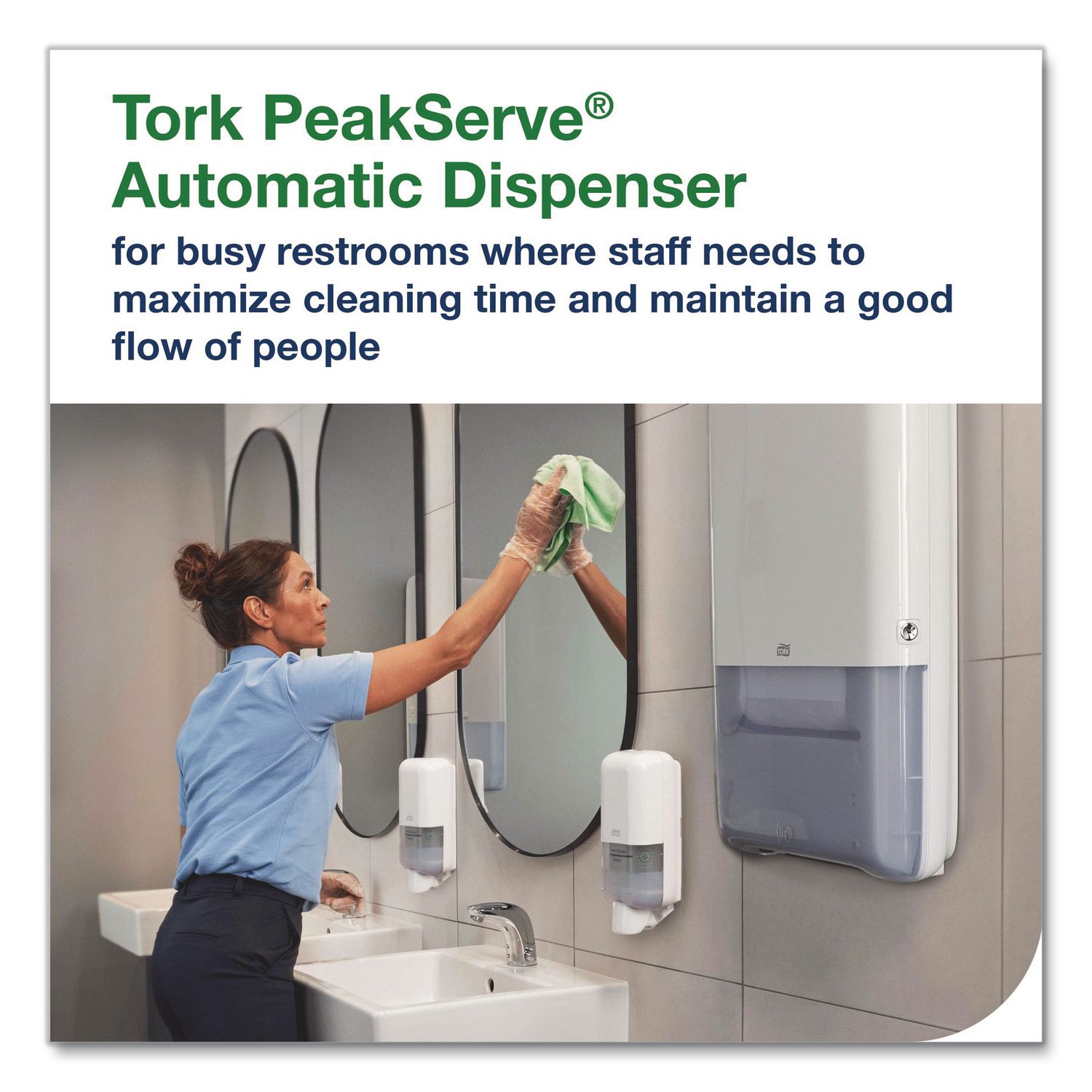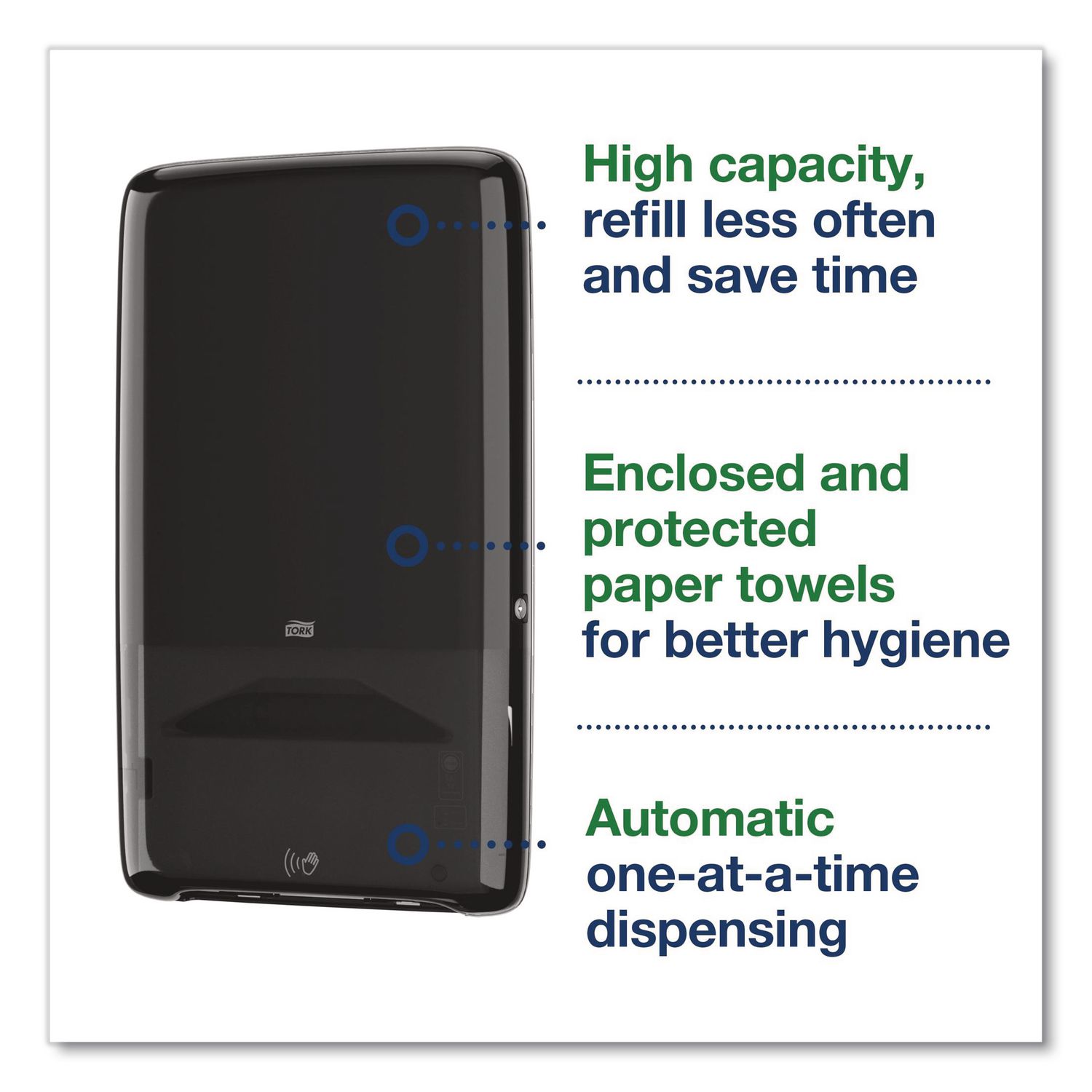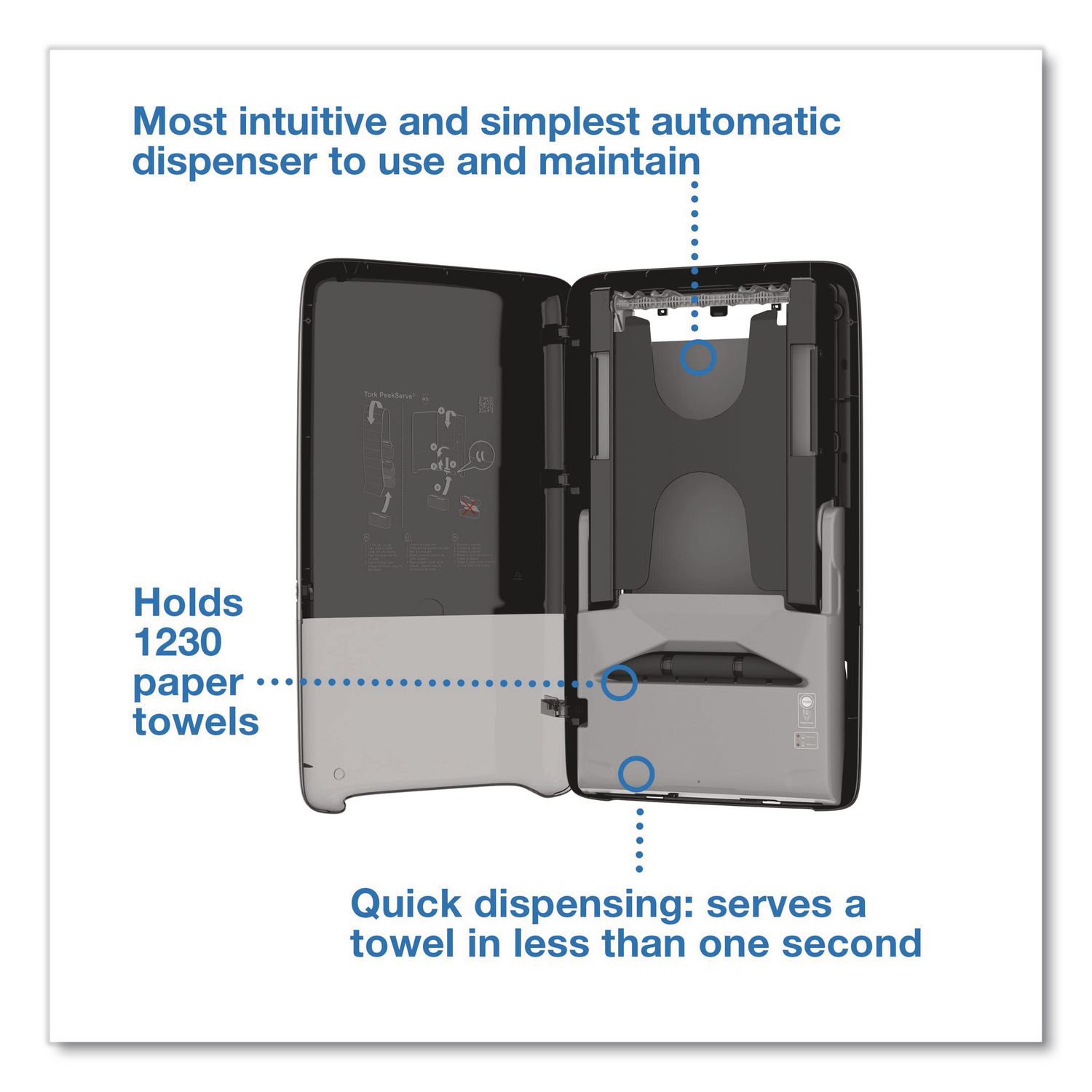 Tork® PeakServe® Automatic Continuous™ dispenser is the latest innovation designed for high-traffic washrooms where staff needs to maximize cleaning time and maintain a good flow of people. It offers the longest battery life and dispenses in less than a second, time after time. Compatible with Tork® PeakServe® Continuous™ hand towels, the system has a very high capacity of 1,230 towels. The compressed refills are fast to load, can be topped up at any time and are easy to store and transport, enabling staff to focus on cleaning, not refilling. Towels Dispensers Type: Folded Towel Dispenser; Dispenser Capacity (text): 1,230 Continuous Towels; Material(s): Plastic; Color(s): Black.