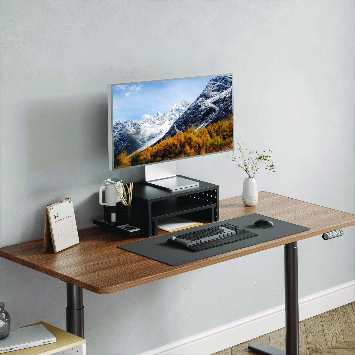 Two versatile risers with pegboards. Ergonomic design elevates the screen to eye level for better viewing. Desk organizer adds more space for additional desk storage. Two large MDF platforms 16.7″ x 12″ each hold your computer or laptop. Handy accessories include tray, pen cup, beverage holder and headphone holders. Weight capacity of 44 lbs for each riser. OEM/Compatible: OEM; Workstation Type: Traditional Desk/Table; Series Name: Pegboard; Width (Max): 15.9″.
