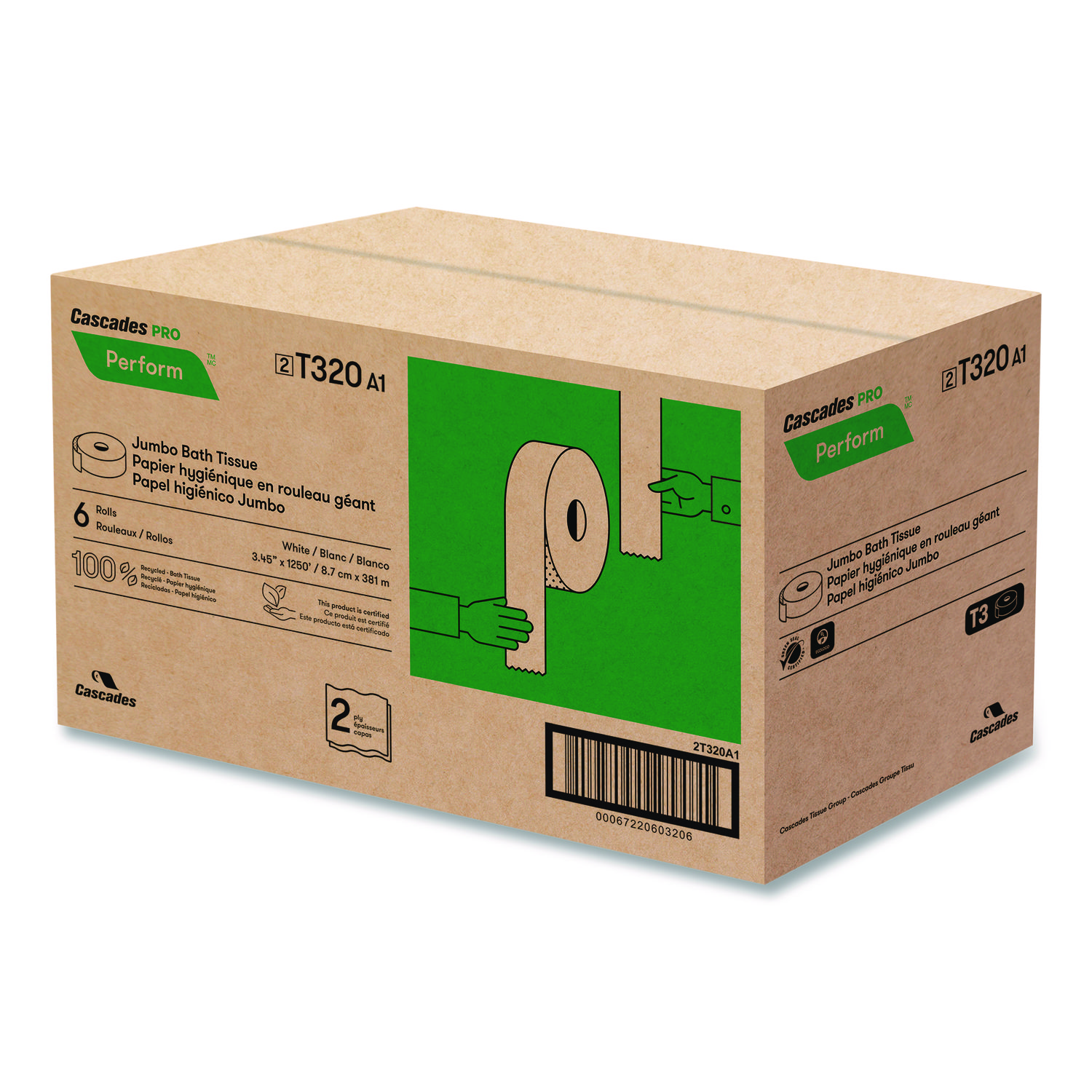 Soft, strong, and absorbent. Versatility is the name of the game. Cascades PRO Perform® offers reliable and performance-driven hygiene solutions that have been certified time and time again. Designed for use in the Cascades PRO Tandem® jumbo toilet paper dispensers (sold separately). Ideal for busy restrooms in educational, retail, industrial and foodservice facilities, and commercial buildings. Safe for all sewer and septic systems. Made from recycled fiber and whitened without chlorine. Tissue Type: Toilet; Number of Plies: 2; Width: 3.45″; Length: 1,250 ft.