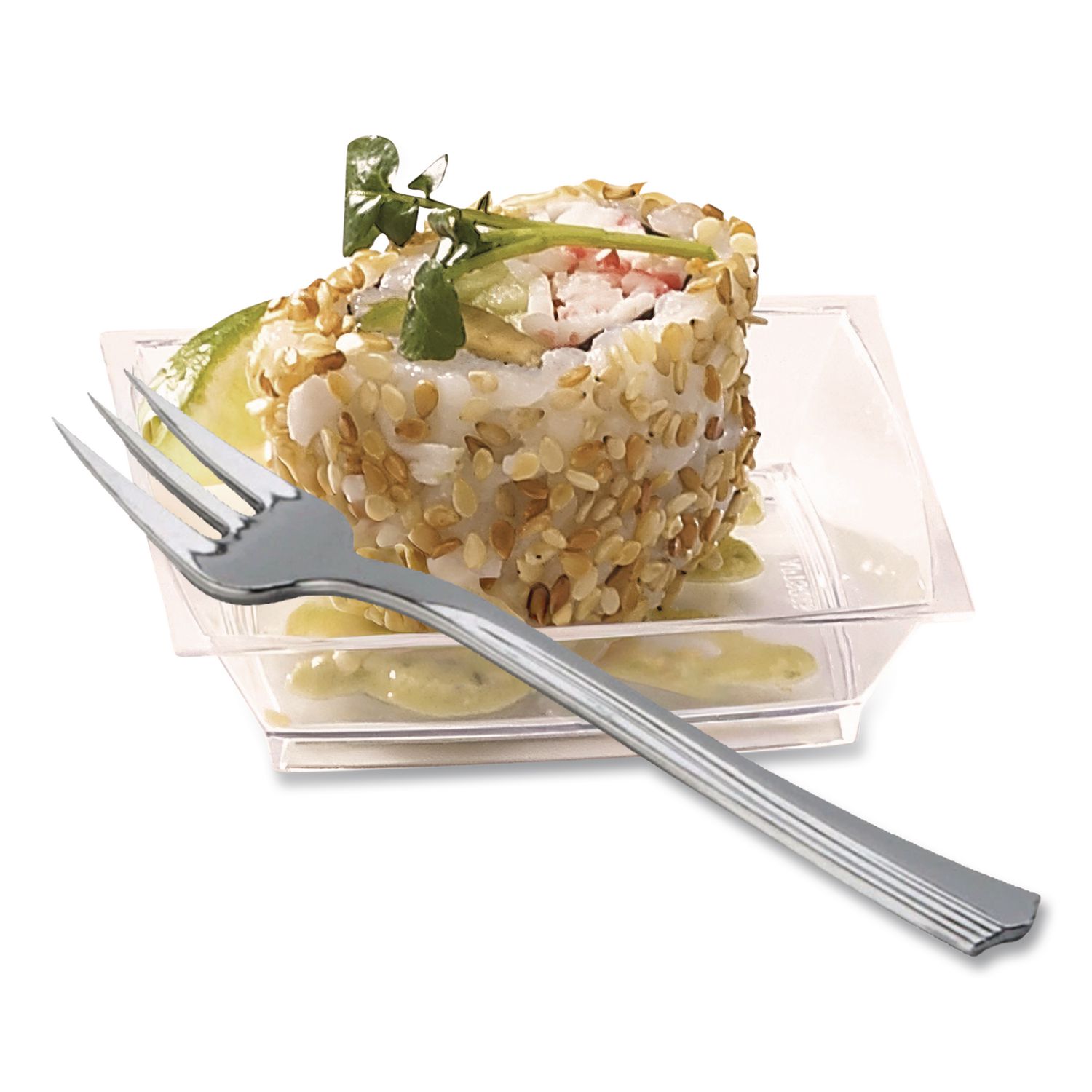 Elegantly shaped petite forks are perfect for tasting and mini-bite service. They also provide a way to control portions. Utensils Type: Petite Tasting Fork; Material Type: Plastic; Material(s): Polystyrene; Color(s): Silver.