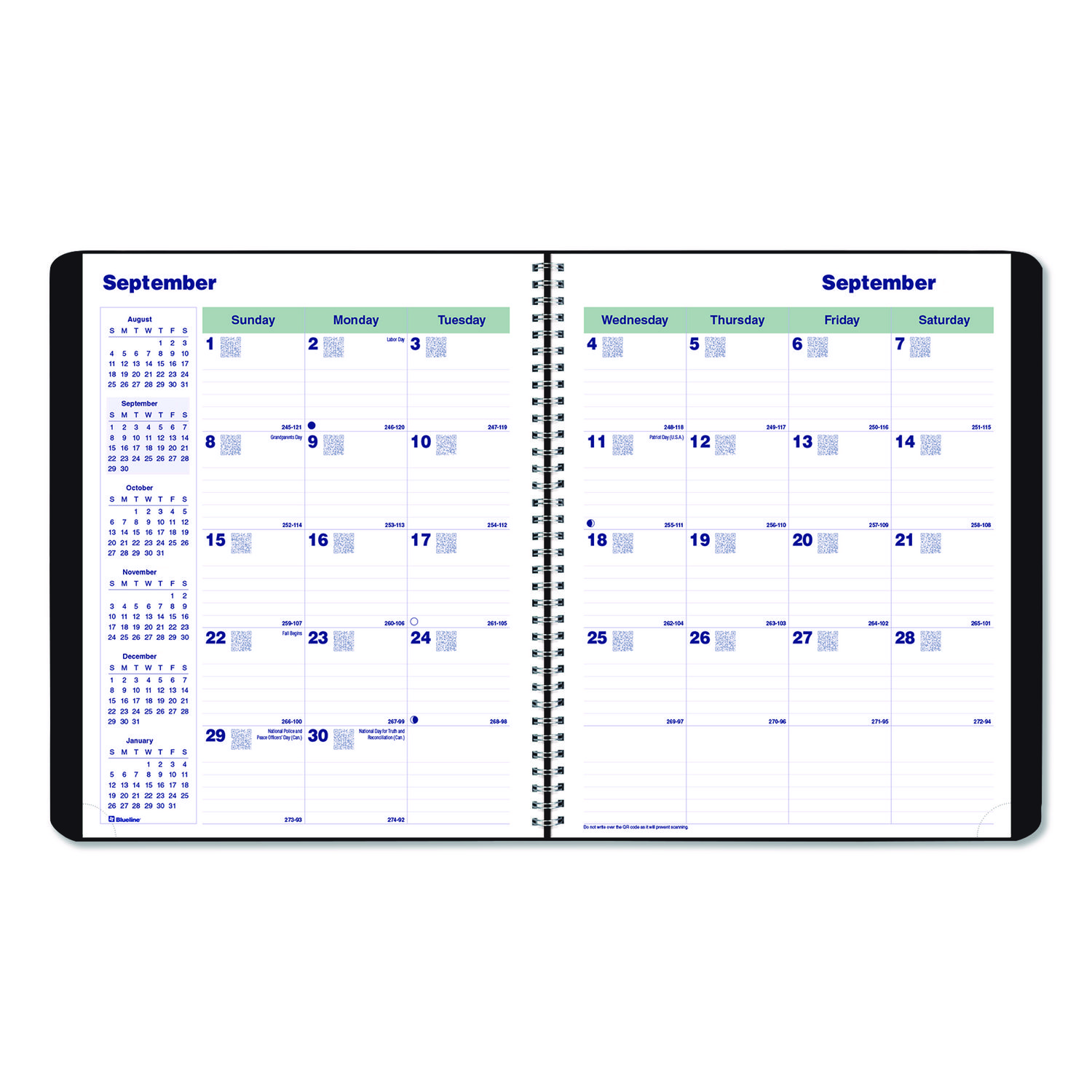 The future of planning is here with the Blueline® Plan & Link™ Monthly Planner. Monthly spreads feature a familiar layout, but each daily block also features a pre-printed QR Code to allow you to easily sync all of your plans with the free Blueline Reminder app. Just plan, scan, click and go. For added convenience, the planner’s expanded range easily accommodates annual transitions, too. A very durable, very attractive faux leather cover and snag-free twin-wire binding work together to keep everything together while allowing the planner to lay flat when open. To reap the full benefits and push your planner to reach its full potential, download the free Blueline Reminder app, powered by inkLink, from the Apple App Store or Google Play. Distressed Faux Leather Cover. Dated: Yes; Academic Year: No; Calendar Format: Monthly; Calendar Spread Format: One Month per Two-Page Spread.