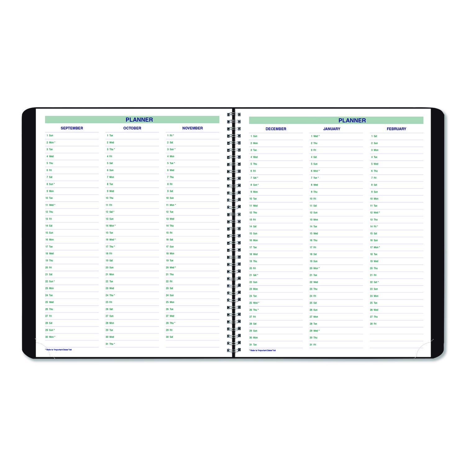 | Calendar Spread Format: | One Month per Two-Page Spread |