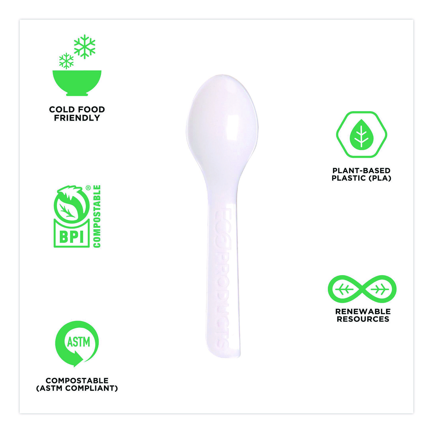 Renewable and compostable Plantware Cutlery is the only choice for compostable cutlery with a high-heat tolerance. New crystalized formulation offers strength and heat tolerance up to 200° F. Handles are now 95% stronger. Renewable, BPI-certified compostable and ASTM compliant. Made from renewable resources. Made with PLA, a plant-based plastic. Meets ASTM standards for composability. Utensils Type: Taster Spoon; Material Type: Plastic; Material(s): Plastic; Color(s): White.