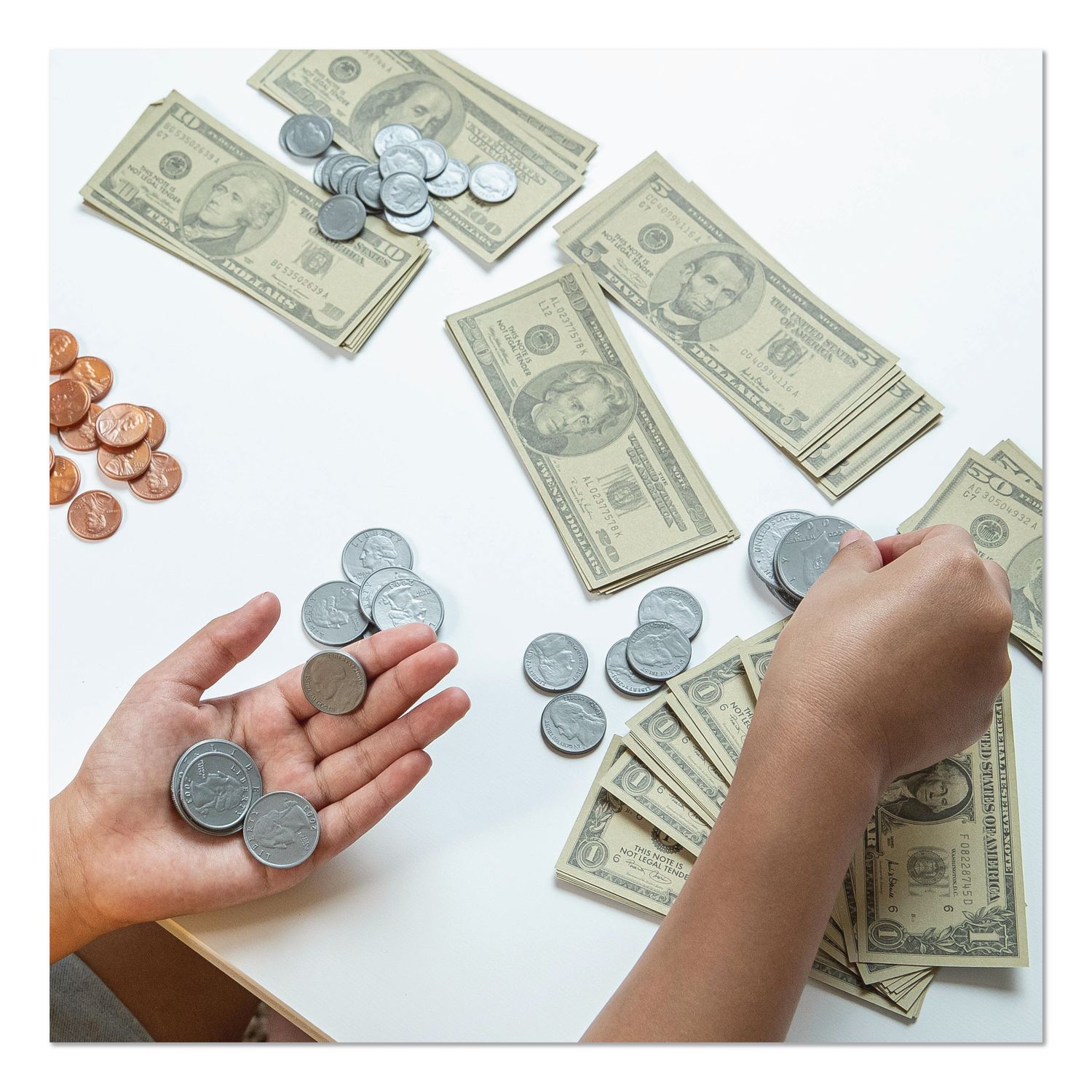No classroom, homeschool or playroom is complete without a full collection of play money! This deluxe set of realistic plastic coins and paper bills helps children learn to recognize difference denominations. Use on its own to teach hands-on financial literacy and early math skills like counting, addition, subtraction and making change; add to an existing favorite (like a toy cash register), and even teach interpersonal skills through fun setups like grocery store pretend play. Includes 100 pennies, 100 nickels, 100 dimes, 100 quarters, 50 half dollars, 100 $1 bills, 50 $5 bills, 50 $10 bills, 50 $20 bills, 25 $50 bills and 25 $100 bills in a deluxe storage tray. Subject Area: Life Skills; Mathematics; Specific Subject: Currency & Money; Age Recommendation: Ages 5 to 9; Grades: Grades K to 4.