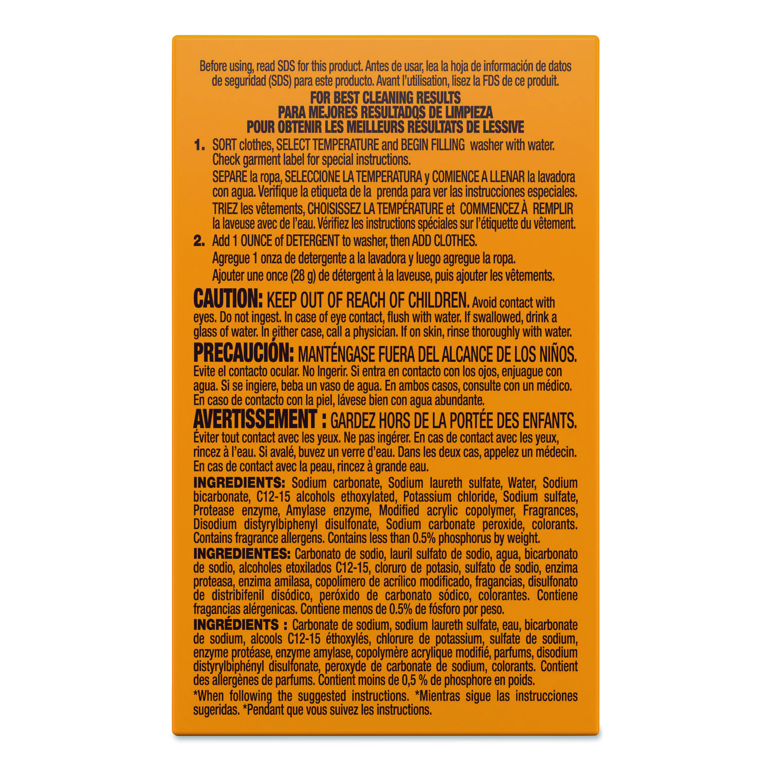 Tried and true detergent is reformulated to pack even more cleaning power into every scoop. OxiClean® stain-fighters knock out the most stubborn laundry problems. Arm & Hammer® baking soda ensures a fresh, clean scent. Color-safe. 2 Wash Loads Per Box. Application: Laundry Detergent; Applicable Material: Fabric; Chemical Compound: Disodium Carbonate; Alcohols; C12-15; Ethoxylated; Dirt Types: Food Stains; Grass Stains; Grease; Oil-Based Soil; Organic Matter; Water-Based Soil.