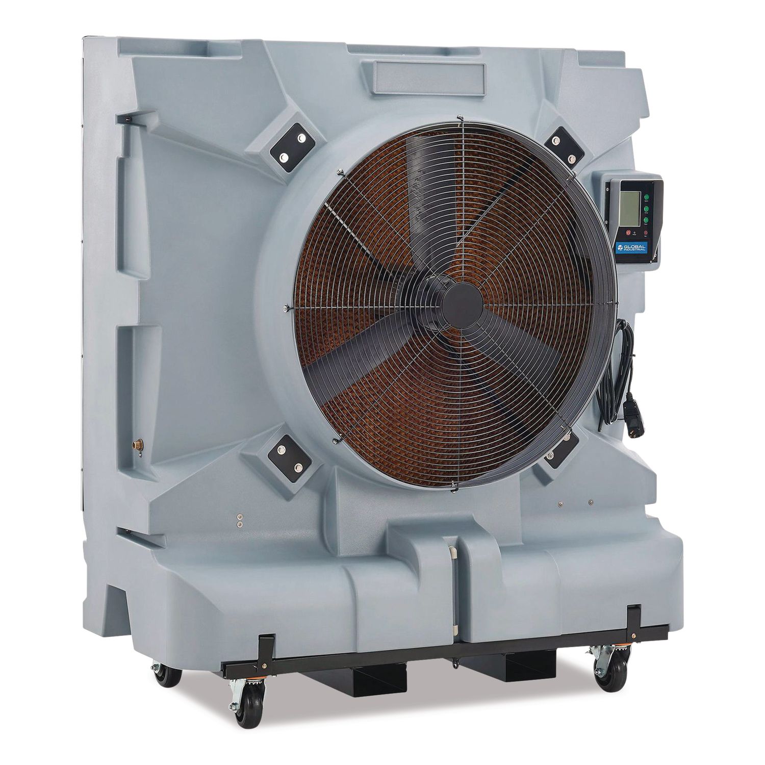 Beat the humidity and the heat with this Portable Evaporative Cooler, a low-cost, solution to keeping spaces cool. Water and forced air are combined in this machine to reduce air temperatures by as much as 26° F. Units are equipped with thick Kraft paper that is coated in water from the pump. The coolers come with a convenient remote control and a micro-computer control panel with easy-to-read LCD display. Built-in timer allows cooler to be programmed to turn on or shut off at preselected times. Also included is an Auto-Shutoff feature for pump motor when water levels drop below the limit. 36″ diameter fan operates at three selectable speeds, and a thick cooling pad ensures reliable heat absorption. Four rubber casters with brakes allow easy mobility along with built-in forklift pockets. Voltage: 115 V; Amps: 7.5 A; Horsepower: 1.18 HP; Motor Phase: Single Phase.