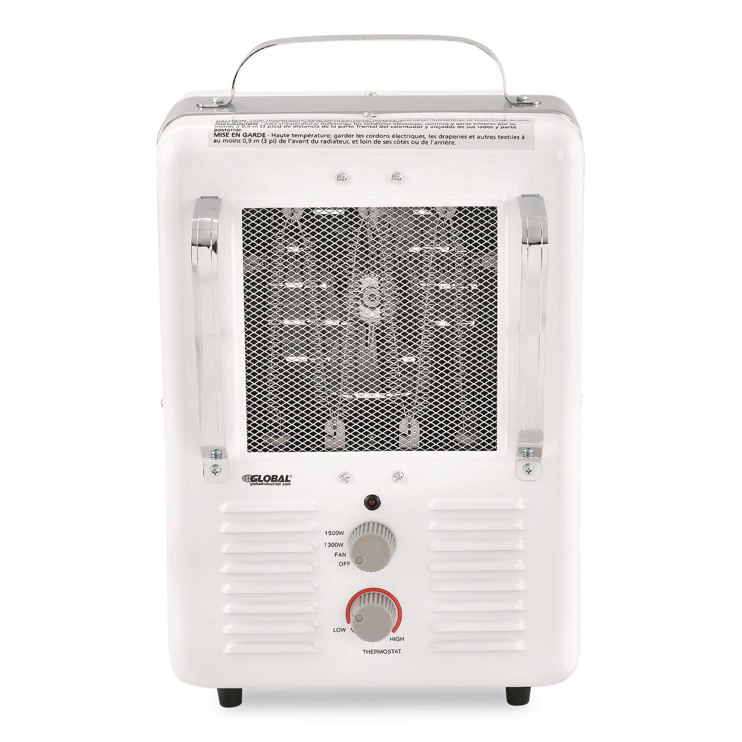 Lightweight and portable. Spot heat your home or office easily with the Global Industrial® Portable Milkhouse Style Electric Heater. This fan-forced heater can deliver up to 5,120 BTU and provide coverage up to 180 sq ft. Its compact space-saving design makes it easy to store away while its durable steel construction and long power cord makes it great for facilities that need to bring supplemental heat to cold small working areas. This heater has built in tip-over switch for added safety as well as thermal cut-off to prevent overheating. The easy-to-use built in turn dial thermostat can be set at your desired comfort level, while an additional setting control knob lets you select your desired heat output or fan only operation. Heater Type: Space Heater; Safety Features: Tip-Over Protection; Setting Range [Max]: 1,500 W; Oscillation: No.