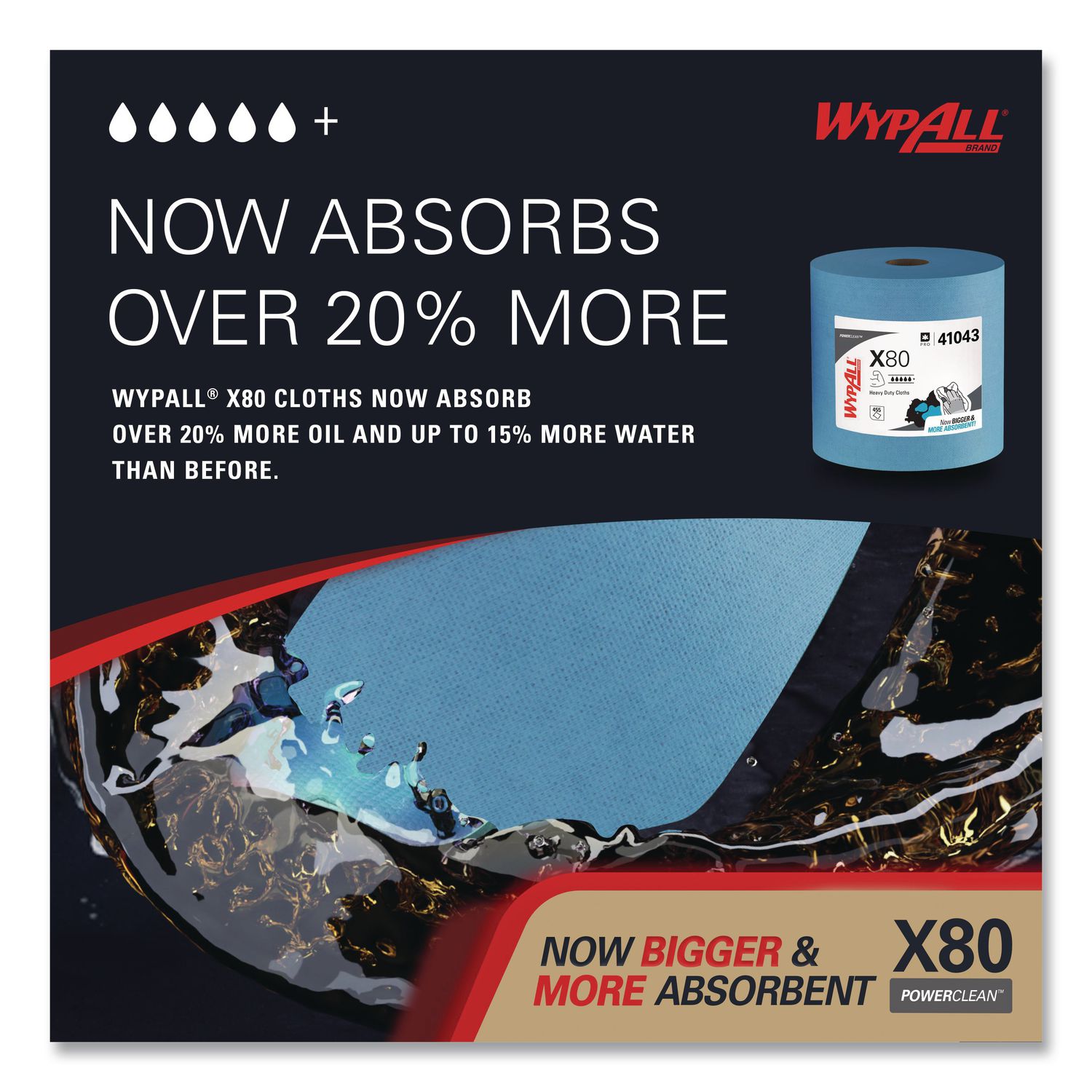 WypAll® is the number one brand of disposable wipes in the US and Canada. Maximize performance while minimizing time, effort and product waste. If you’ve been using industrial cloth towels, it’s time to make the switch to WypAll® PowerClean™ X80 Cloths. These cloths feature innovations like high-tech Hydroknit® fast-absorbing material and are durable for scrubbing. WypAll® X80 cloths now absorb over 20% more oil and up to 15% more water than before. In addition, they now feature a tough, precision-engineered surface texture, making them even more effective for your cleaning tasks. The heavy-duty cloths are made of soft pulp fibers, bonded to a polypropylene base sheet for absorbency and durability, making them suitable for removing dirt, oil, grime and solvents in industrial and manufacturing businesses. The cloths are reusable and reinforced for strength when wet and dry. These bulk cloths are a great alternative – safer and more efficient – to replace laundered rental shop towels and cleaning towels. These premium industrial cleaning cloths can be used for heavy-duty machine and part wiping, wiping metal shavings, prepping surfaces with solvents, and cleaning rough surfaces. When you’re running a business, it pays to use the very best supplies. For the toughest grease and grime, trust the performance and innovation of WypAll® PowerClean™ X80 Heavy Duty Cloths. Jumbo Roll. Towel/Wipe Type: Perforated Roll Towels; Material(s): Hydroknit; Color(s): Blue; Dirt Types: Dust; Lint; Liquid.