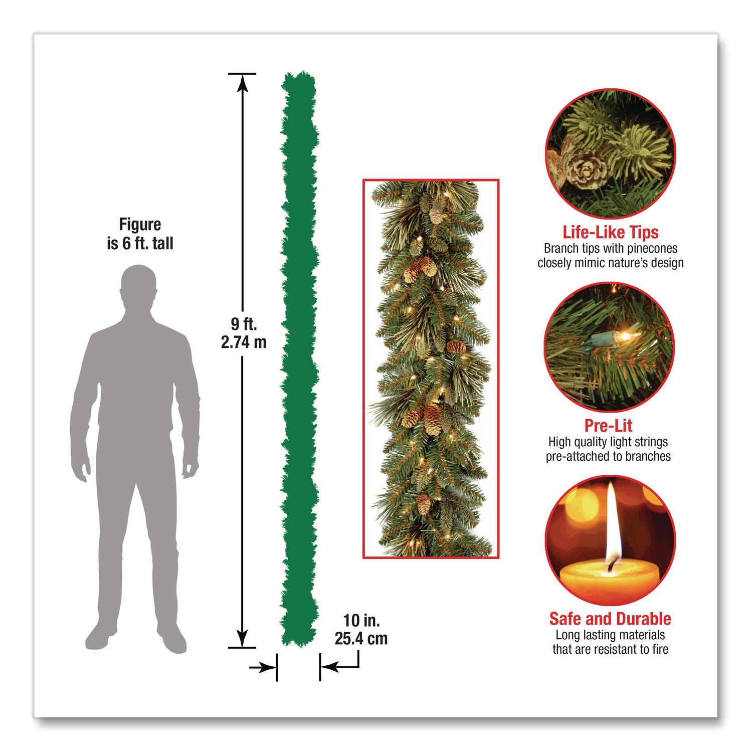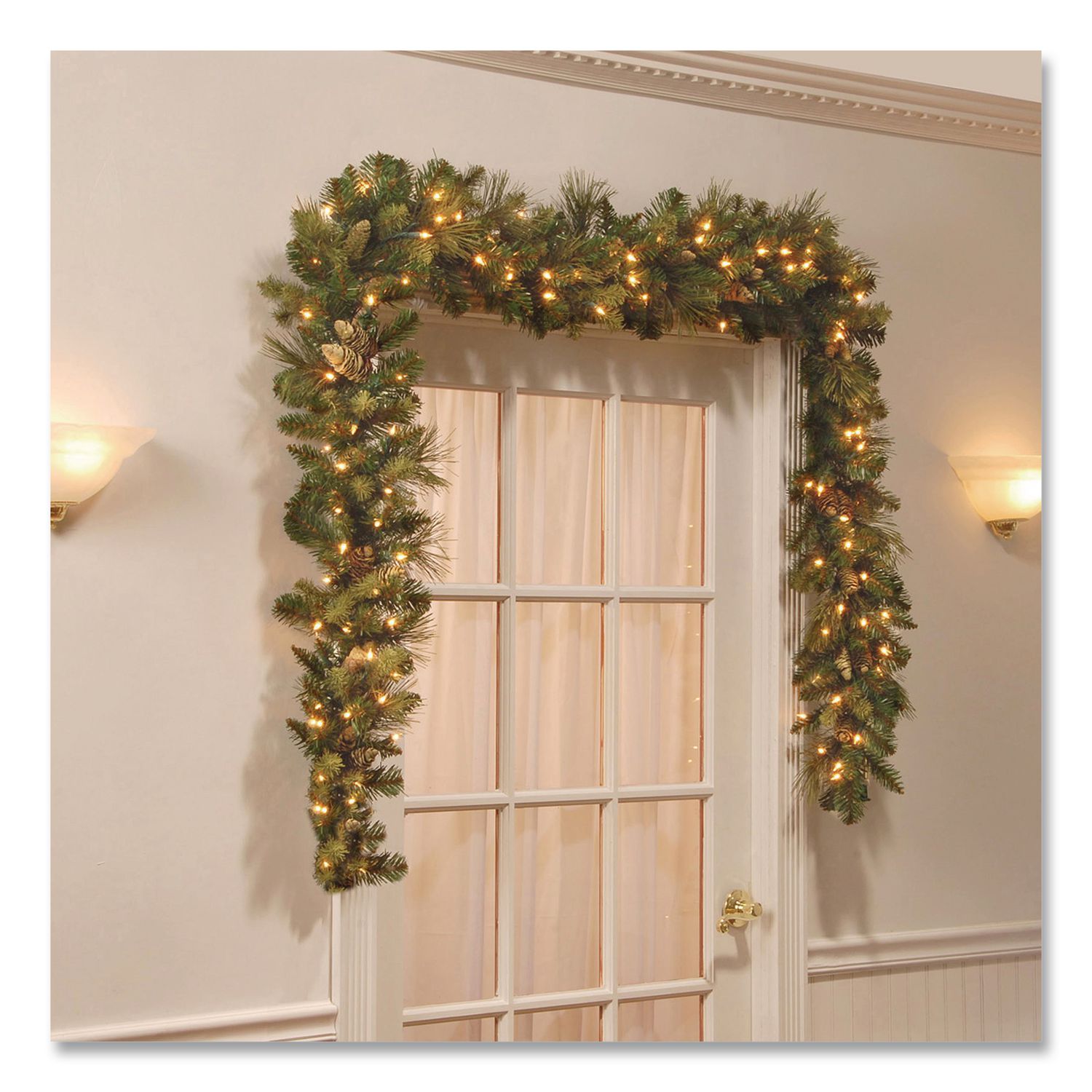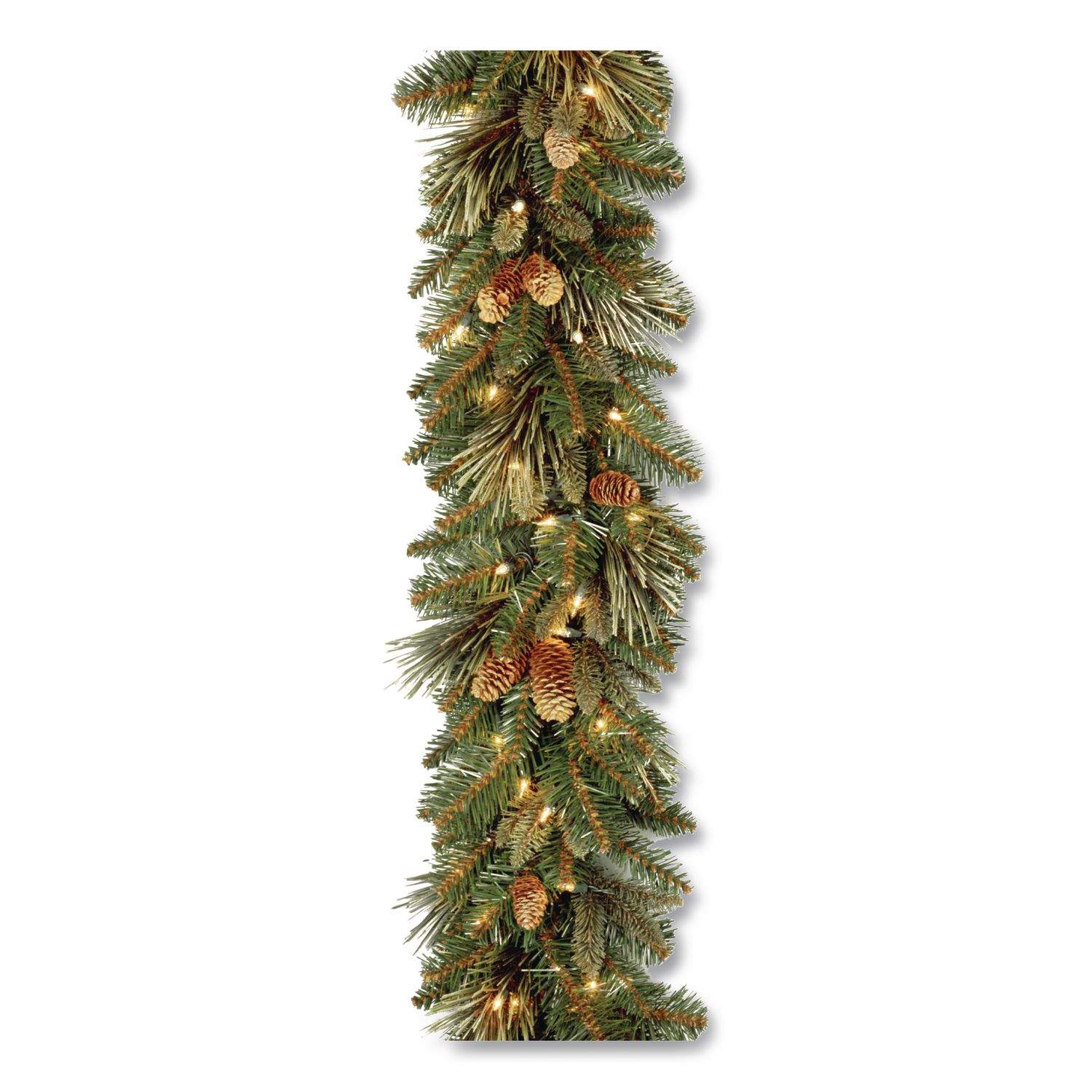 This Carolina Pine garland features mixed bristle and cashmere branch tips and is trimmed with pine cones. It is pre-strung with 100 clear lights that remain lit even if a bulb burns out. This indoor, outdoor garland can be displayed over doors, windows, fireplace mantels, fence or stairway railings. Holiday/Season: Christmas; Indoor/Outdoor: Indoor/Outdoor; Color(s): Green; Color Family: Green.