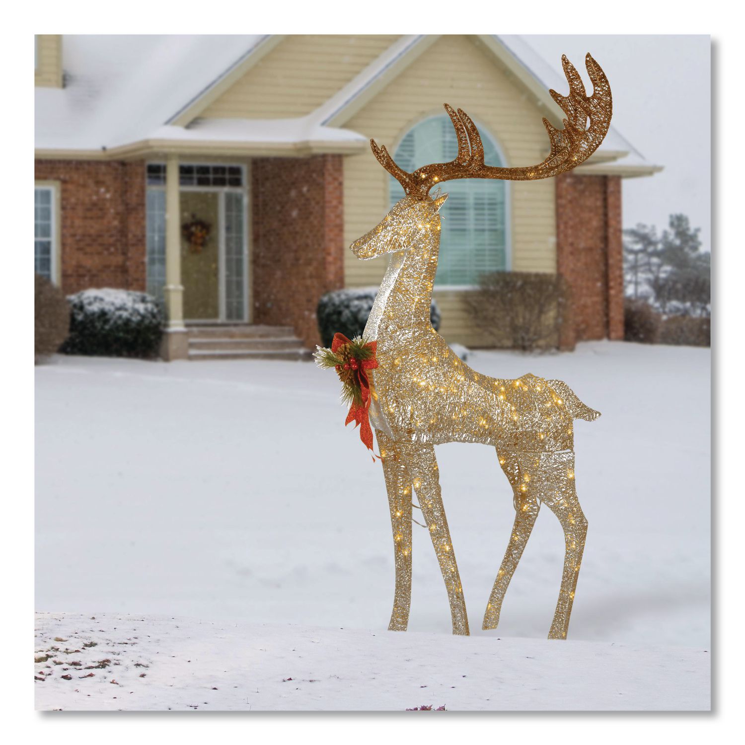 This majestic standing Buck is made with a glittered rigid sisal material wrapped around a wire frame, for an attractive decoration that is strong and durable. The champagne color adds a touch of sophistication and glamour to your decor. It is pre-lit with 120 warm white twinkling LED lights that sparkle and shine. This seasonal trimming features a bright red bow with bristle, pinecones and berries. For indoor or outdoor display. Holiday/Season: Christmas; Indoor/Outdoor: Indoor/Outdoor; Color(s): Assorted; Color Family: Multicolor.