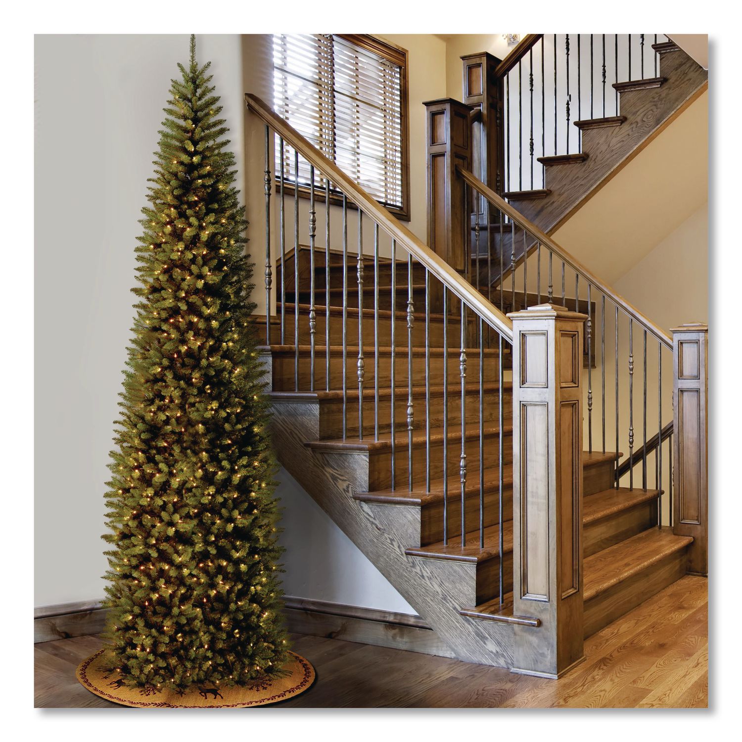 Though tall in height, this Kingswood Fir tree has a pencil thin profile that may make it better for display in corners or areas with limited floor space, compared to typical full width trees of similar height. It is pre-strung with clear lights that remain lit even if a bulb burns out. This tree features hinged branch construction for ease of assembly. Sturdy metal tree stand is included. Plant Type: Fir; Plant Color: Green; Color Family: Green; Frosted: No.