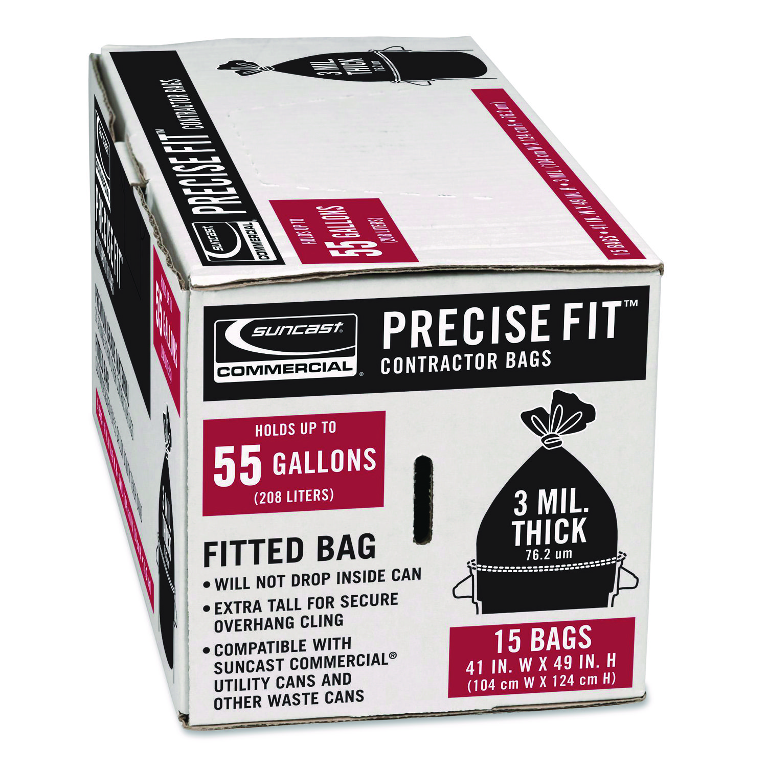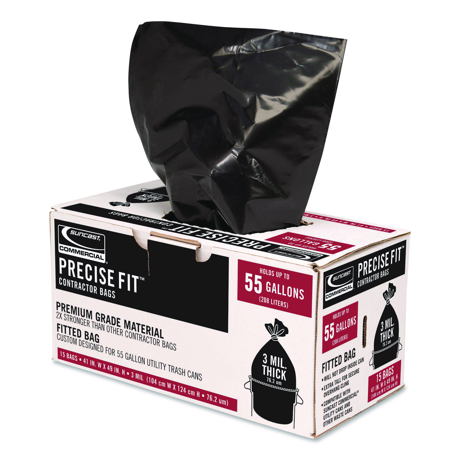 The Precise Fit contractor bag is uniquely designed to fit Suncast Commercial® utility cans and other waste cans. With premium grade material, these bags are two times stronger than competing contractor bags. These bags will not easily collapse into the can as items are tossed inside. They are extra tall for a secure overhang cling, and will withstand multiple jobs. Commercial/Consumer Use: Commercial Use; Maximum Volume Range: 51 to 60 gal; Maximum Volume Capacity: 55 gal; Weight Capacity (Dry): 40 lb.