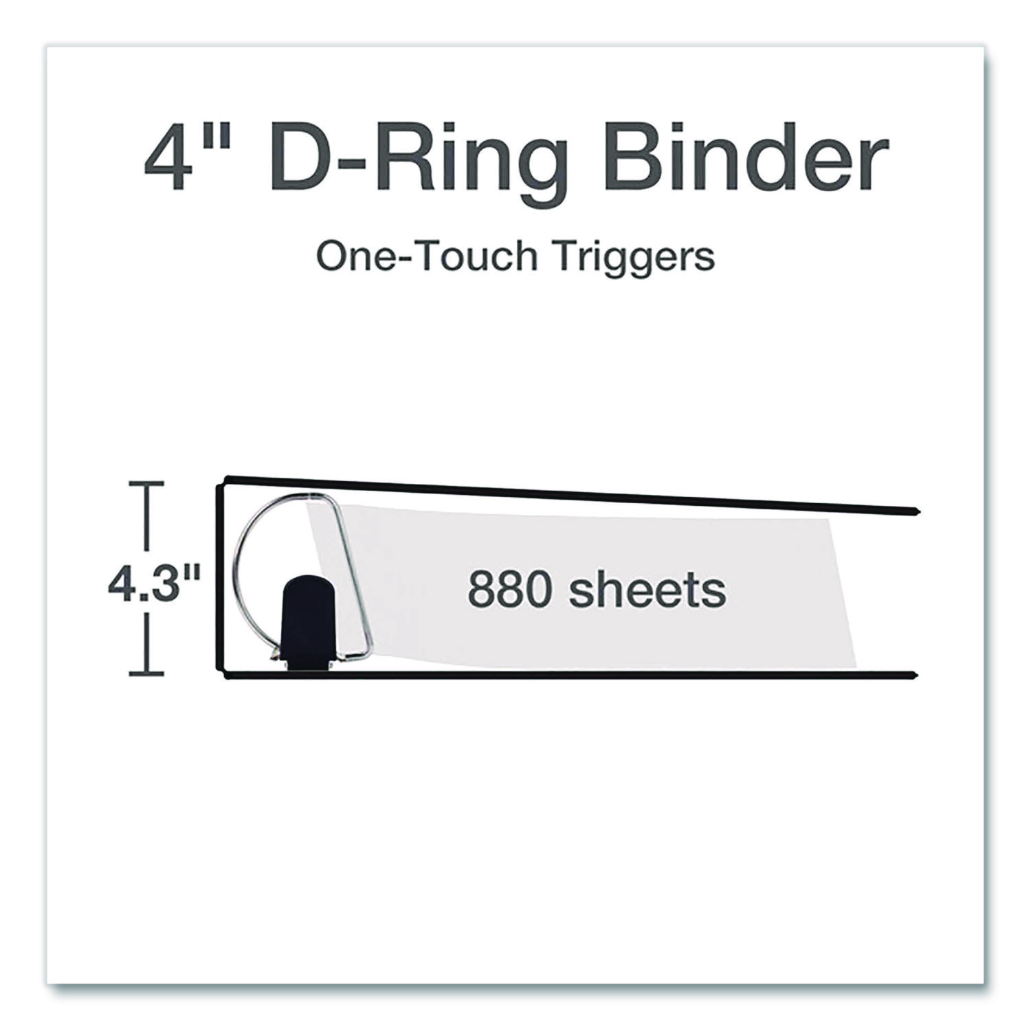 ONE-TOUCH® Easy Open® Slant D® rings open, close and lock with one simple motion. Heavy-duty construction equals lasting durability. ClearVue™ covers for three-sided customization: insert custom title sheets on the front, back and spine for a professional looking presentation. PVC-free. Binder Type: Ring; Binder Style: View; Binder Size Capacity: 4″; Binder Sheet Capacity: 775.