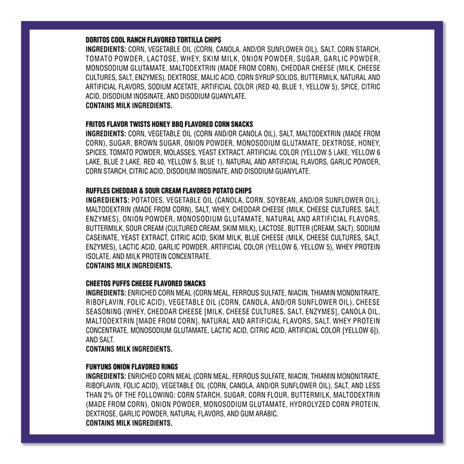 | Package Includes: | (6) Cheetos Puffs; (6) Cool Ranch Doritos; (5) Frito's Honey BBQ; (5) Funyuns; (8) Ruffles Cheddar & Sour Cream |