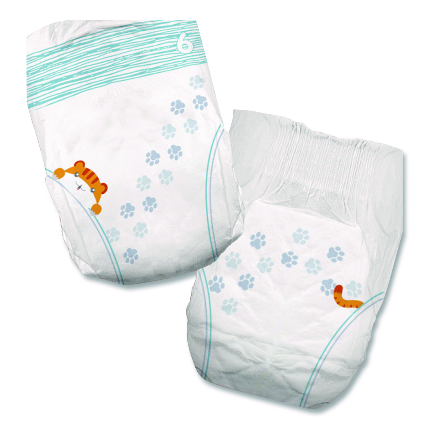 Keep moisture away from babies’ skin with these premium absorbency baby diapers. The hypoallergenic construction is ideal for infants with sensitive skin. The cloth-like outer layer adds a soft finish to each diaper. Easy-lock fastener tabs provide an adjustable fit, while leg cuffs and an elastic waistband deliver added comfort. Feature a unisex design and ultra-absorbent core, providing reliable protection against leaks for girls and boys. Diaper Style: Baby Diapers; Diaper Size: 6; Baby Weight Range Min [Min]: 35 lbs; Liner Material: Ultra Absorbent.