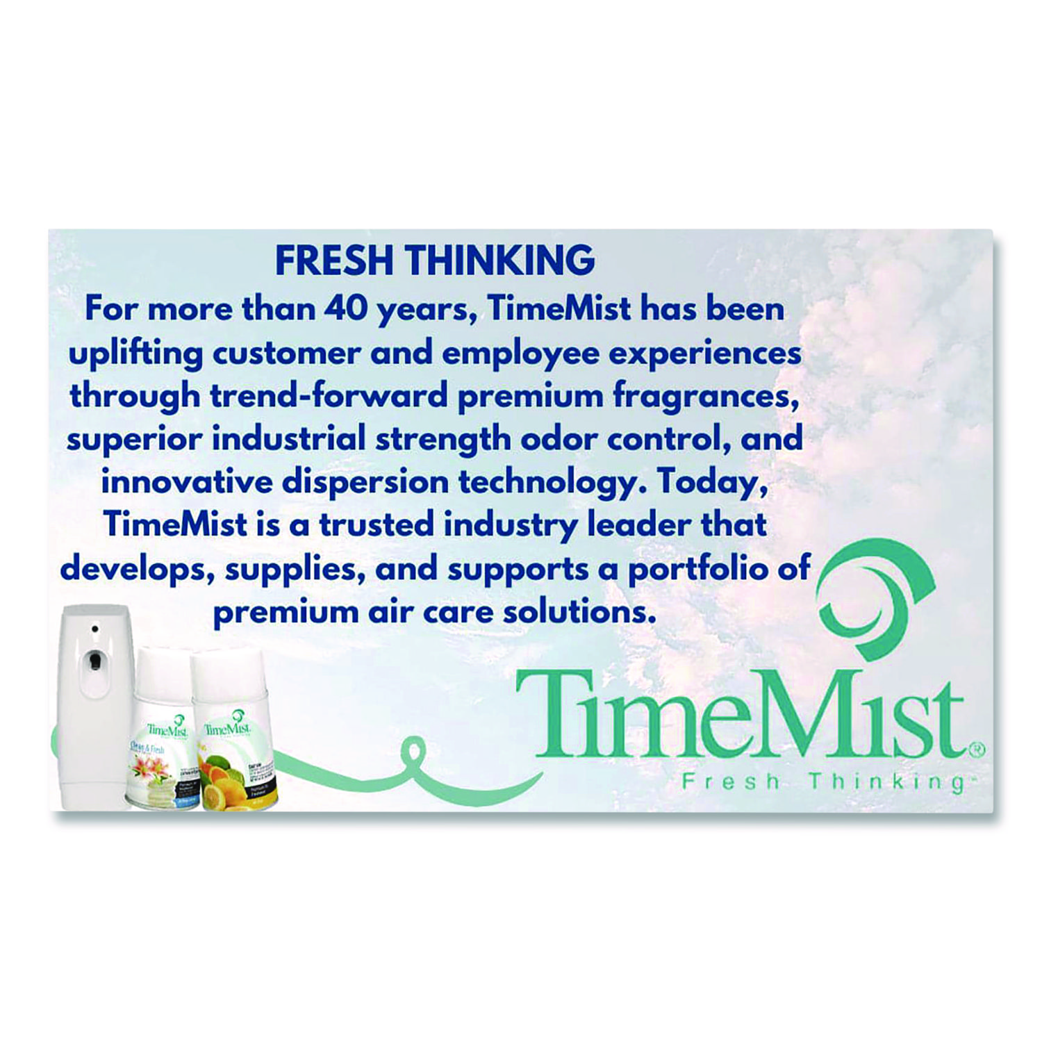 Complex high quality fragrance with essential oils and dual odor counteracts ensuring 30 day long lasting experience. For use with TimeMist® Metered Aerosol Dispensers (sold separately). Scent: Baby Powder; Physical Form: Liquid; Application: Odor Control; Volume Capacity: 7.1 oz.