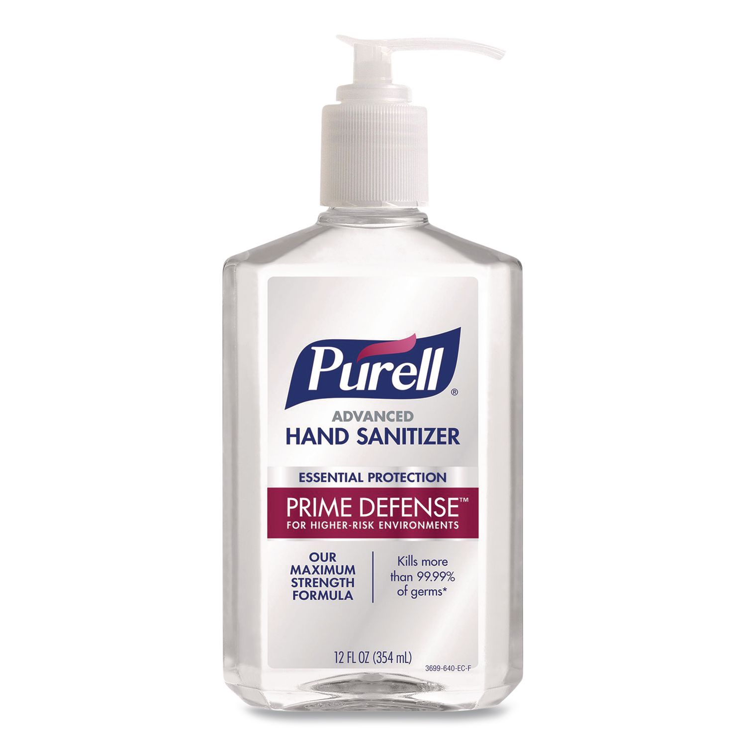 Originally designed for close-quarter settings with higher risks, PURELLĀ® Prime Defense Advanced Hand Sanitizer has the efficacy necessary for urgent needs as well as your everyday life. Maximum strength formulation features 85% ethyl alcohol and advanced technology that breaks down germ cell walls. This professional-grade hand sanitizer kills a wide range of germs with more than 99.99% efficacy. Hands feel clean and refreshed after every use. Perfect to strategically place in offices, small businesses and work-from-home environments. Hand Sanitizers Type: Gel; Color(s): Clear; Volume Capacity: 12 oz; Product Packaging: Pump Bottle.