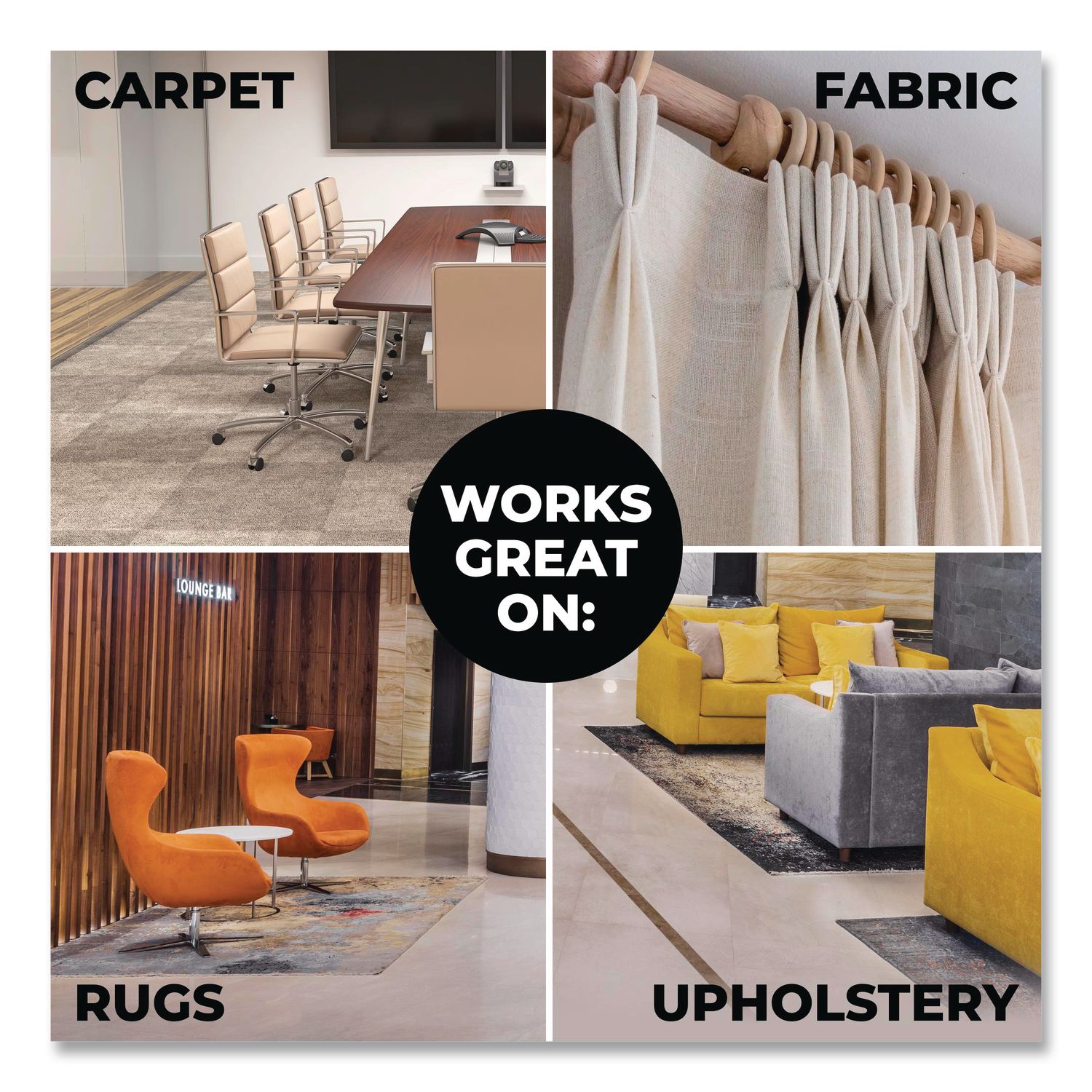 Simple Green PRO Carpet Cleaner removes dirt, oil, food spills and stains from carpets, rugs, fabric and upholstery. Will not damage carpet fibers or backings. Concentrated formula dilutes for great value. Cleans and deodorizes without harmful amines or bleach that can cause damage and discoloration. Use manually, or with pre-spray and extraction equipment. Strong enough to deep clean high-traffic areas, but gentle enough for everyday use. Application: Carpet/Upholstery Cleaner; Applicable Material: Carpets; Fabric; Rugs; Upholstery; Chemical Compound: Aqueous Based Mixture; Dirt Types: Dirt; Food; Oil; Stains.