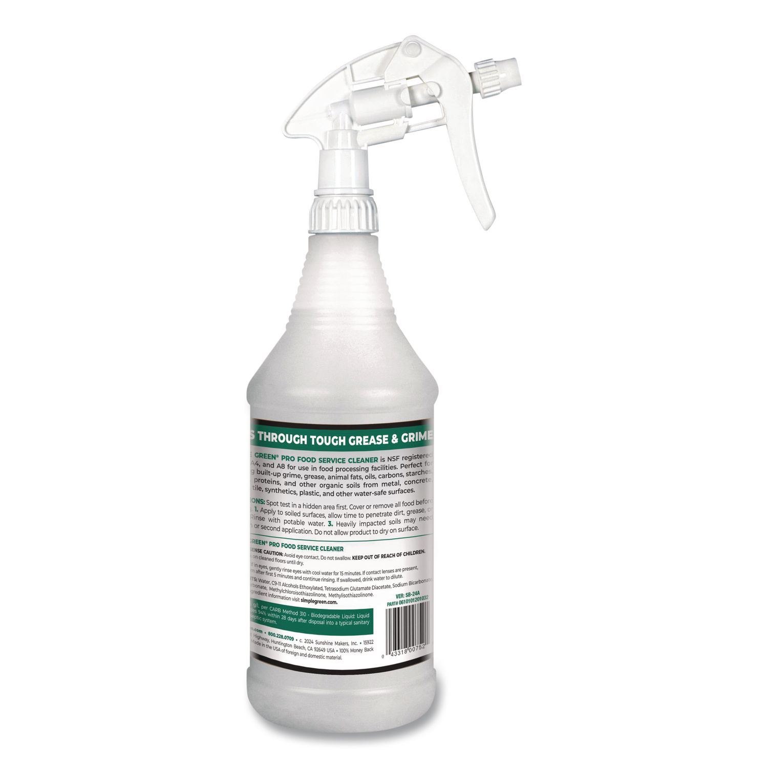Simple Green PRO Food Service Cleaner is a powerful, professional-strength cleaner and degreaser that cuts through even tough baked-on foods, grease and built-up grime without harsh chemicals. NSF registered A1, A2, A4, A8, B1 and C1 for use in commercial kitchens and other areas where food is prepared or handled. PRO Food Service Cleaner is the perfect choice for restaurants, bars, cafeterias, food trucks, bakeries, coffee shops, lunchrooms and more. Works great on all washable surfaces including counters, walls, floors, appliances, cooking equipment, stoves, range hoods, utensils and laundry. The clean-rinsing formula contains no added color or scent. Convenient, ready-to-use trigger spray formula. Application: Degreaser/Cleaner; Applicable Material: Cement/Concrete; Ceramics; Enamel; Fiberglass; Laminates; Metal; Plastic; Chemical Compound: Aqueous Based Mixture; Dirt Types: Dirt; Food Residues; Grease; Grime; Oil.