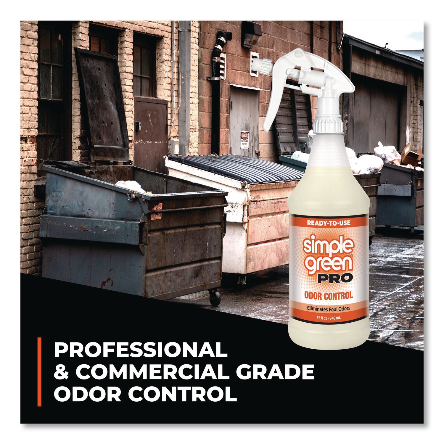 Simple Green Pro Odor Control Ready-to-Use neutralizes odors using advanced natural enzymes and microorganisms. The long lasting formula works on wet or dry surfaces, indoors and out. Use anywhere organic odors form. Neutralizes foul smells in public restrooms, fleet vehicles, dumpsters, farms, gyms, locker rooms, animal quarters, motels, schools and more. Eliminates odors caused by decayed vegetation, food, garbage, graywater, animals, manure, mold, mildew, skunk, sweat, urine, vomit and other stubborn smells. Convenient, ready-to-use trigger spray formula keeps areas smelling fresh. Scent: Herbal; Physical Form: Liquid; Application: Animal Quarters; Dumpsters; Farms; Fleet Vehicles; Gyms; Locker Rooms; Motels; Public Restrooms; Schools; Volume Capacity: 32 oz.