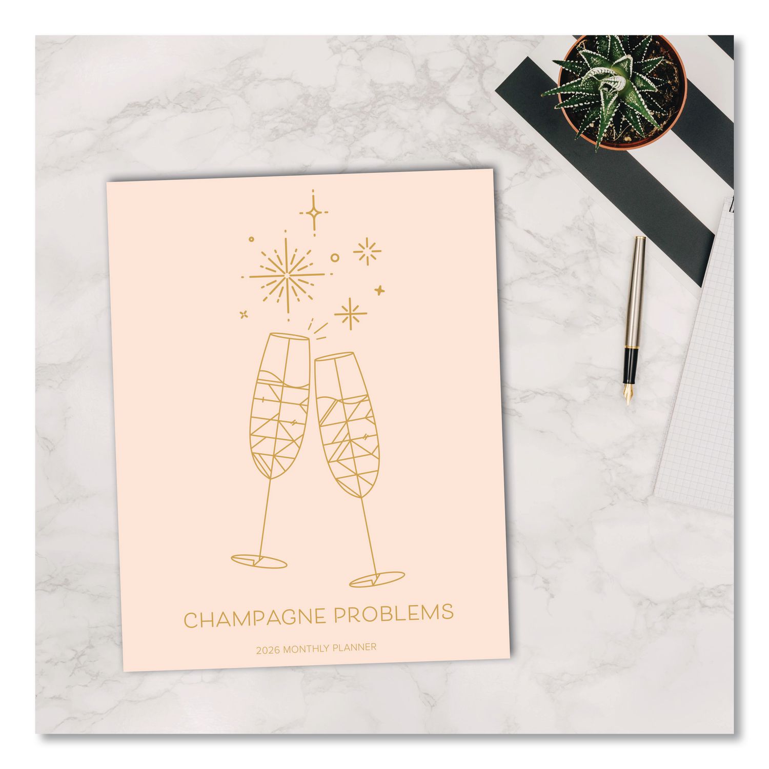Stay organized with a touch of humor in this lyric-inspired Champagne Problems booklet planner, featuring plenty of space for your appointments, tasks and thoughts. This planner is your go-to tool for organizing weeks with clarity and intent. Ready to go wherever your journey takes you. Find inspiration, take notes and enjoy the peace of mind that comes from being proactive and prepared. Dated: Yes; Academic Year: No; Calendar Format: Monthly; Calendar Spread Format: One Month per Two-Page Spread.