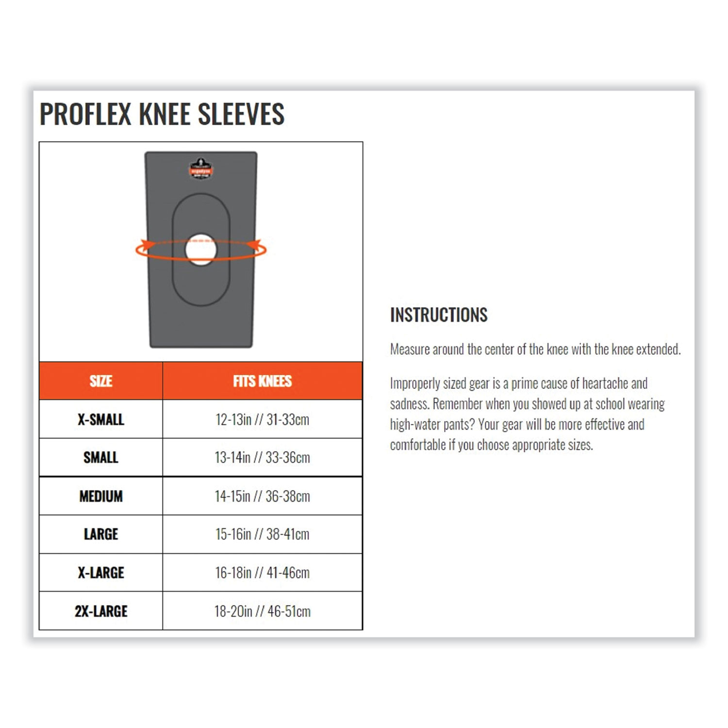 The ProFlex 615 Neoprene Compression Knee Sleeve with open patella and anterior pad provides comfortable knee and joint support on and off the worksite. The perforated neoprene stretch fabric compresses the knee to improve blood flow, aiding in pain relief and joint flexibility. This knee sleeve is a great solution for reducing pain and increasing productivity, particularly for those frequently kneeling on the job. This comfortable latex-free knee compression sleeve is made with a breathable perforated neoprene that does not limit range of motion, plus additional anterior padding for enhanced comfort and support. Soft spandex mesh in the knee crease further enhances airflow for all-day wear. The ambidextrous pre-curved design fits naturally on either leg and easily slides on over the knee for a snug fit. The low-profile style easily fits underneath clothing, but also can be worn on top depending on preference. Elbow/Knee Pad Type: Knee; Size Group: 2X-Large; Closure Type: Slip-On; Material(s): Neoprene.