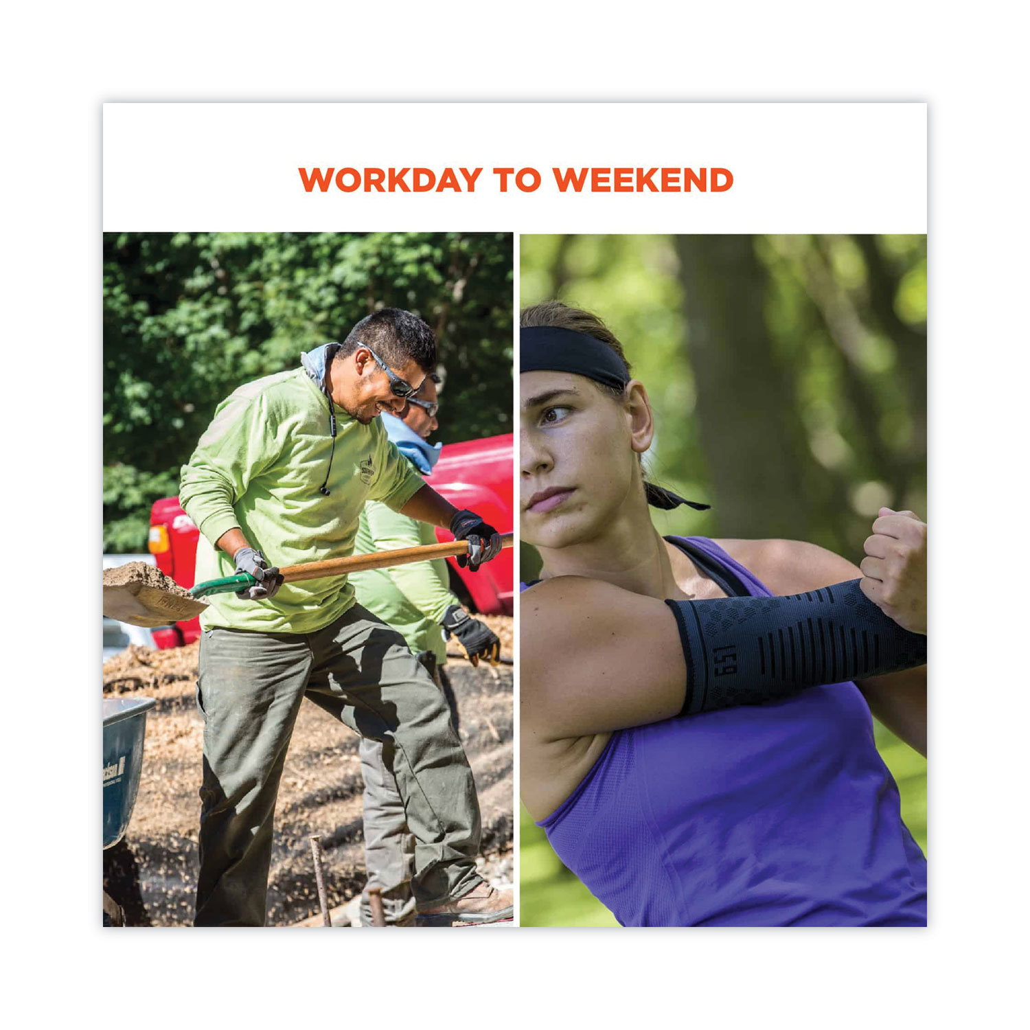 The ProFlex 651 Elbow Compression Sleeve provides breathable comfort and support to relieve elbow pain on and off the worksite. The elbow sleeve compresses the joint to improve blood flow and reduce swelling. It also lends support for an improved sense of joint stability. Increase productivity by reducing pain and accelerating injury recovery with this elbow compression sleeve. Both breathable and supportive, the durable knit compression material also enables full range of motion for all-day comfort. The compression arm sleeve easily slides on over the elbow and the knit pattern provides a snug, anti-slip fit while in use. It is gray with black accents for a low-profile wear. To determine ideal size, measure the circumference four inches above your elbow joint. If you are between sizes, go down for increased compression and up for reduced compression. Elbow/Knee Pad Type: Elbow; Size Group: Medium; Material(s): Nylon; Spandex; Color(s): Gray/Black.