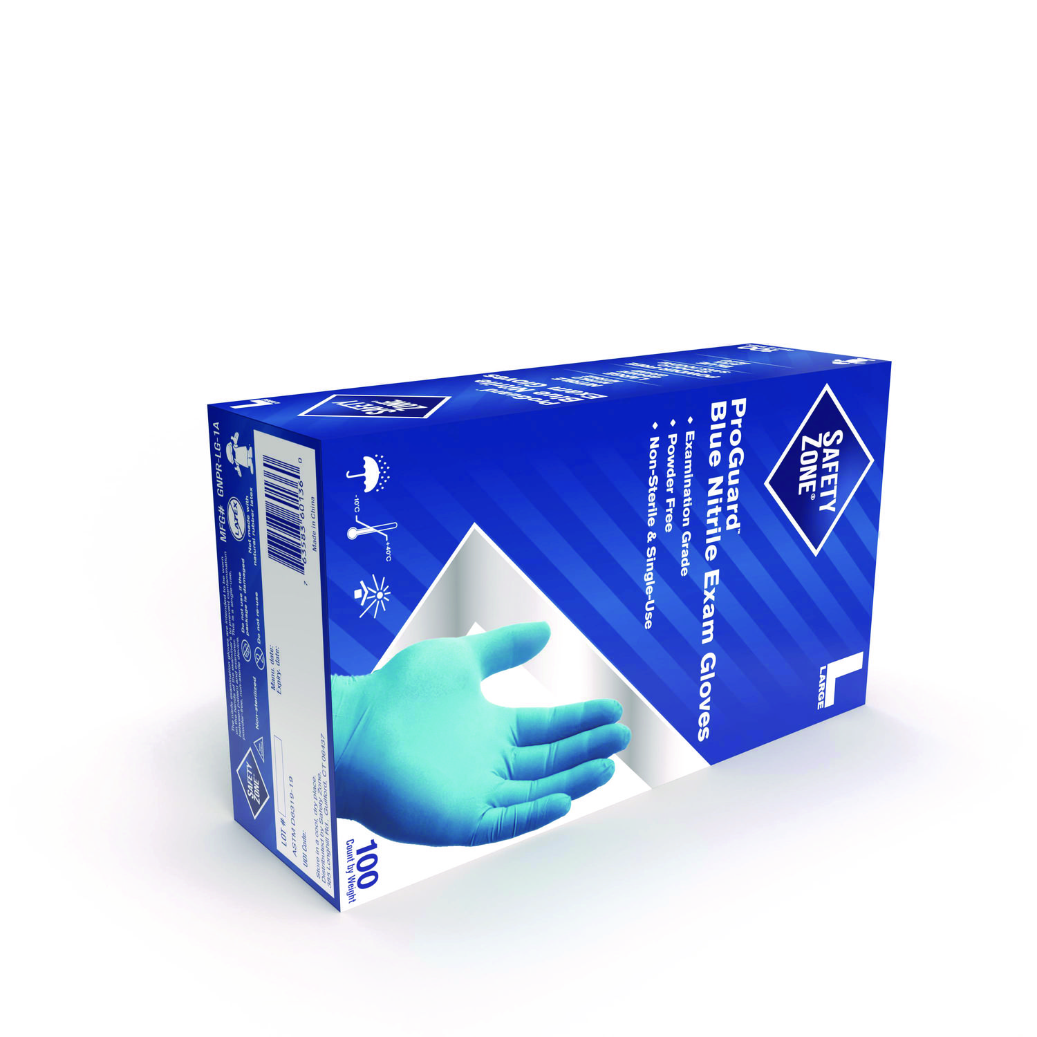 ProGuard Nitrile Gloves, Powder-Free, Large, 3 mil (Palm), 3.5 mil (Fingers), Blue, 100/Box, 10 Boxes/Carton