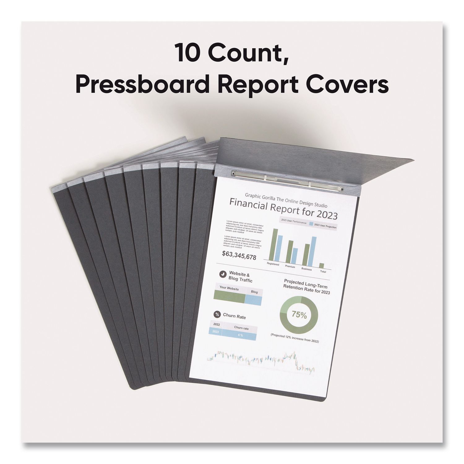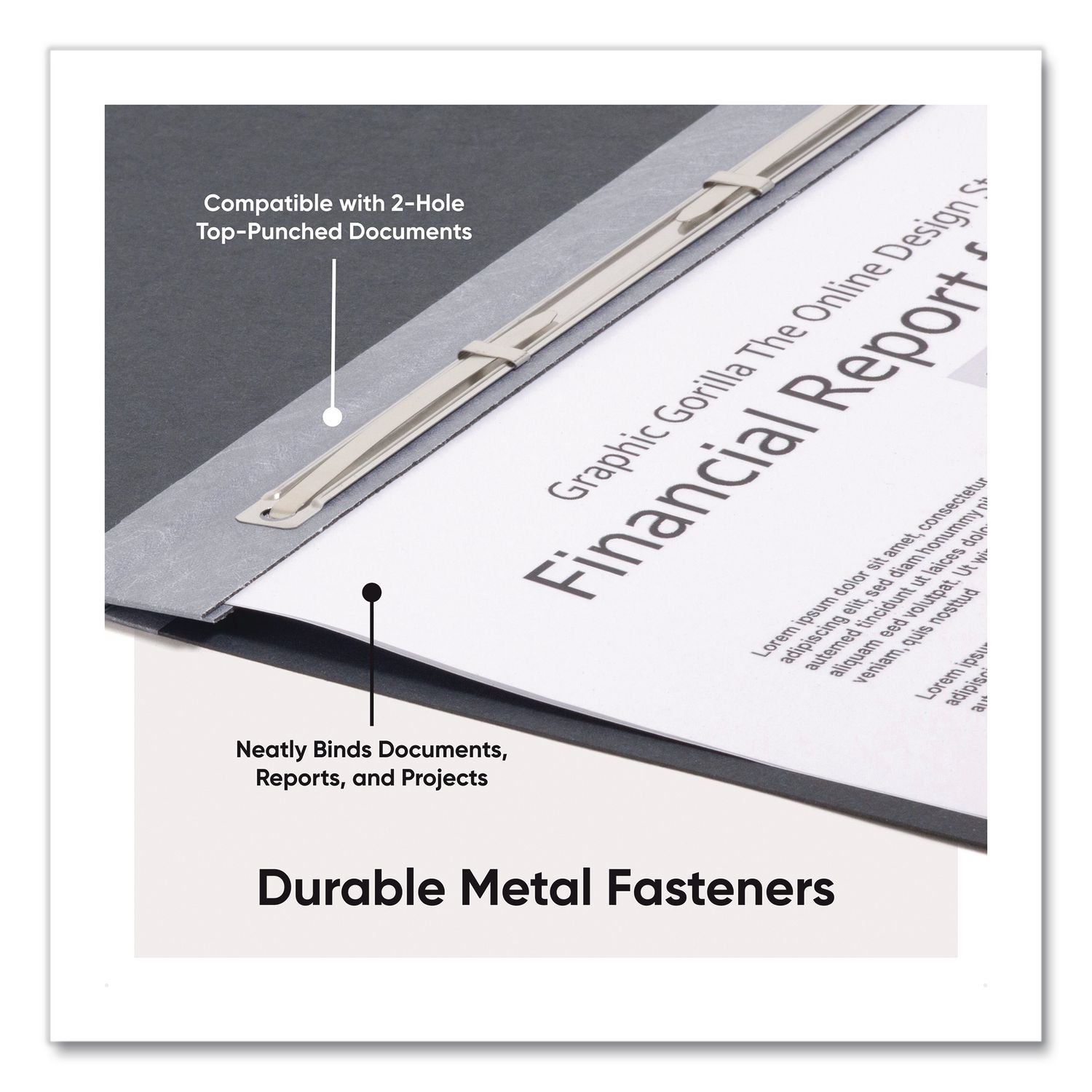 Two-piece coated premium pressboard cover compresses material tightly to reduce bulk. Neatly bind and cover presentations, reports, manuscripts, proposals or other documents that require loose leaf style binding. Made of heavy-duty 25 point colored premium pressboard stock for added durability. Coated to resist moisture and stains. Fastener 8.5″ center to center. Embossed title panel on front cover. Front Cover Color(s): Black; Color Family: Black; Back Cover Color(s): Black; Sheet Size: 11 x 17.