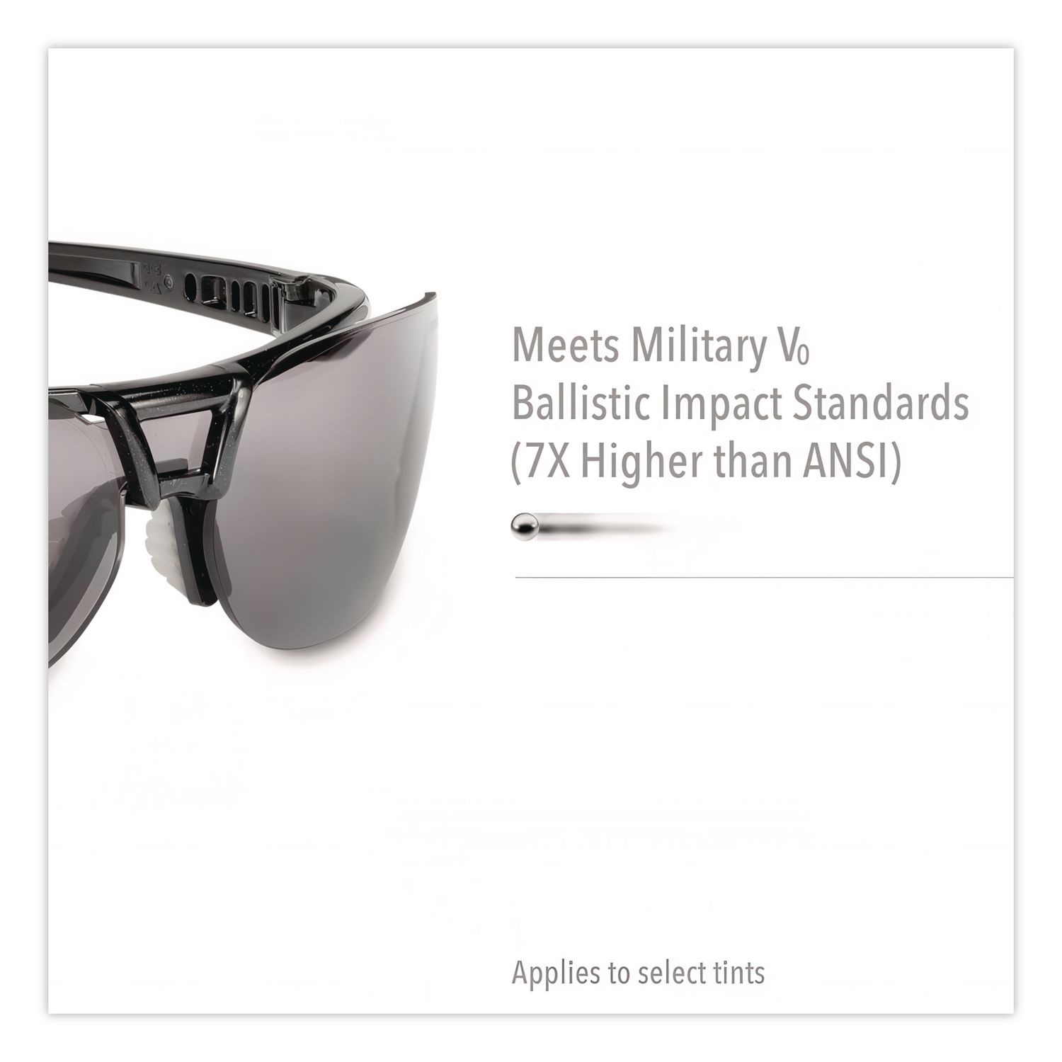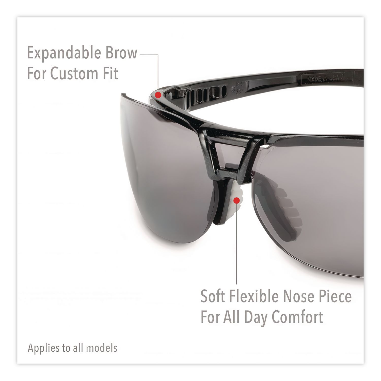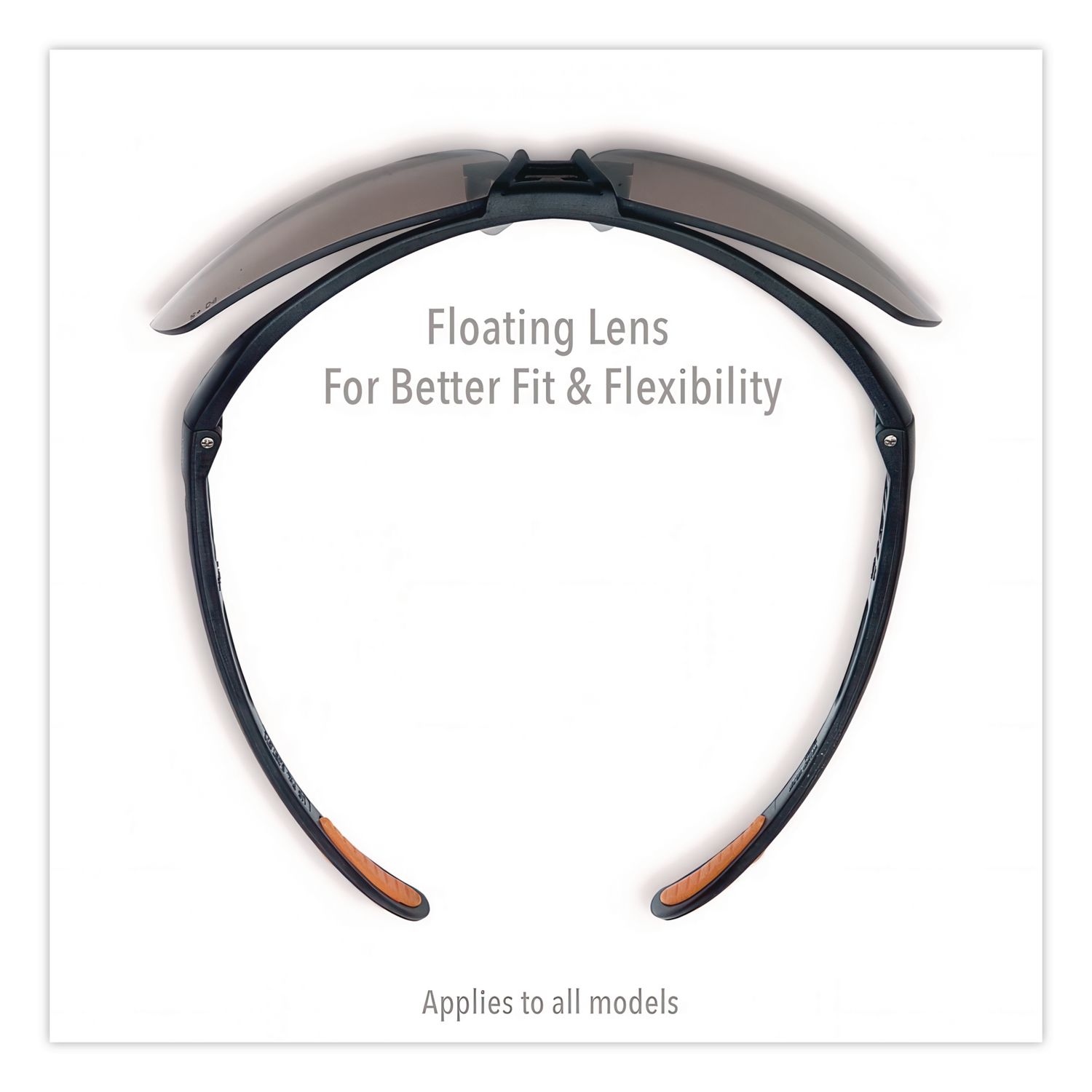 Proprietary Floating Lens™ design and expanding wraparound brow provide premium fit flexibility. Soft, conforming nosepiece features flexible “fingers” to minimize slippage. Contoured, no-pressure temple tips ensure wearing comfort. Specs weigh less than an ounce–comfort never felt so light. 99.9% ultra-violet protection. Meet ANSI Z87.1+ high-impact standard. Safety Glasses Style: Half Frame; Frame Color: Metallic Black; Arm Color: Metallic Black; Frame/Arm Material: Plastic.