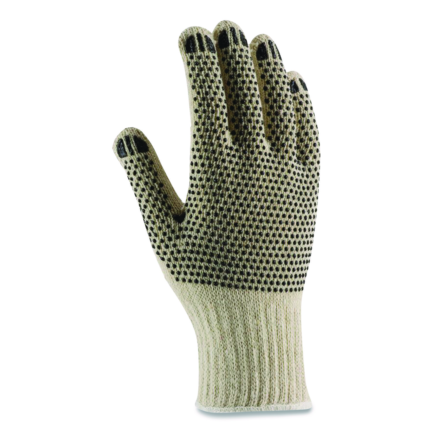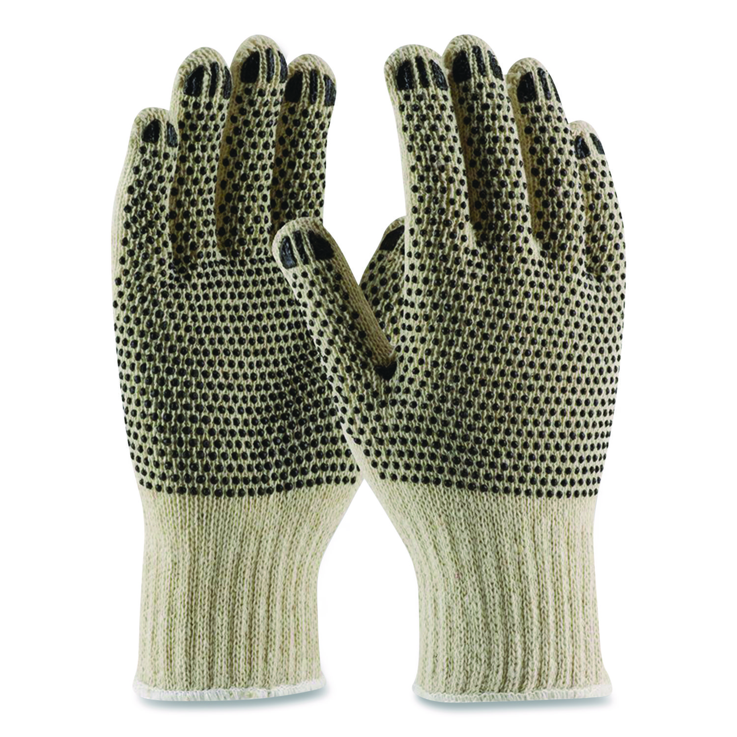 Get a grip with PIP. Cut- and scratch-resistant, breathable cotton-polyester gloves feature PVC dots on both sides for enhanced performance and extra durability. Continuous, elastic-knit wrist helps prevent dirt and debris from entering the glove. Ideal for warehousing, shipping/receiving, commercial bottling, construction and similar applications. Anti-Vibration: No; Size Type: Large; Color(s): Beige/Black; Color Family: Multicolor.