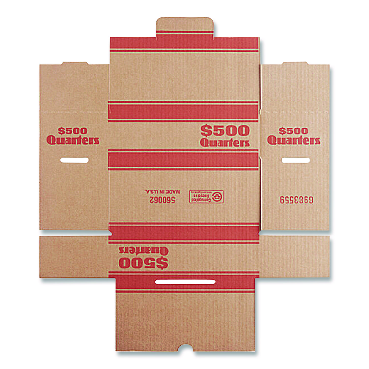 Heavy-duty box is made for coin organizing, shipping, and storing rolls of coins. The sturdy tuck-type lid stays closed during shipping. Made of corrugated material with ABA color coding. Items Stored: Coins; Number of Compartments: 1; Denomination: Quarters; Bill/Coin Capacity: 2,000.