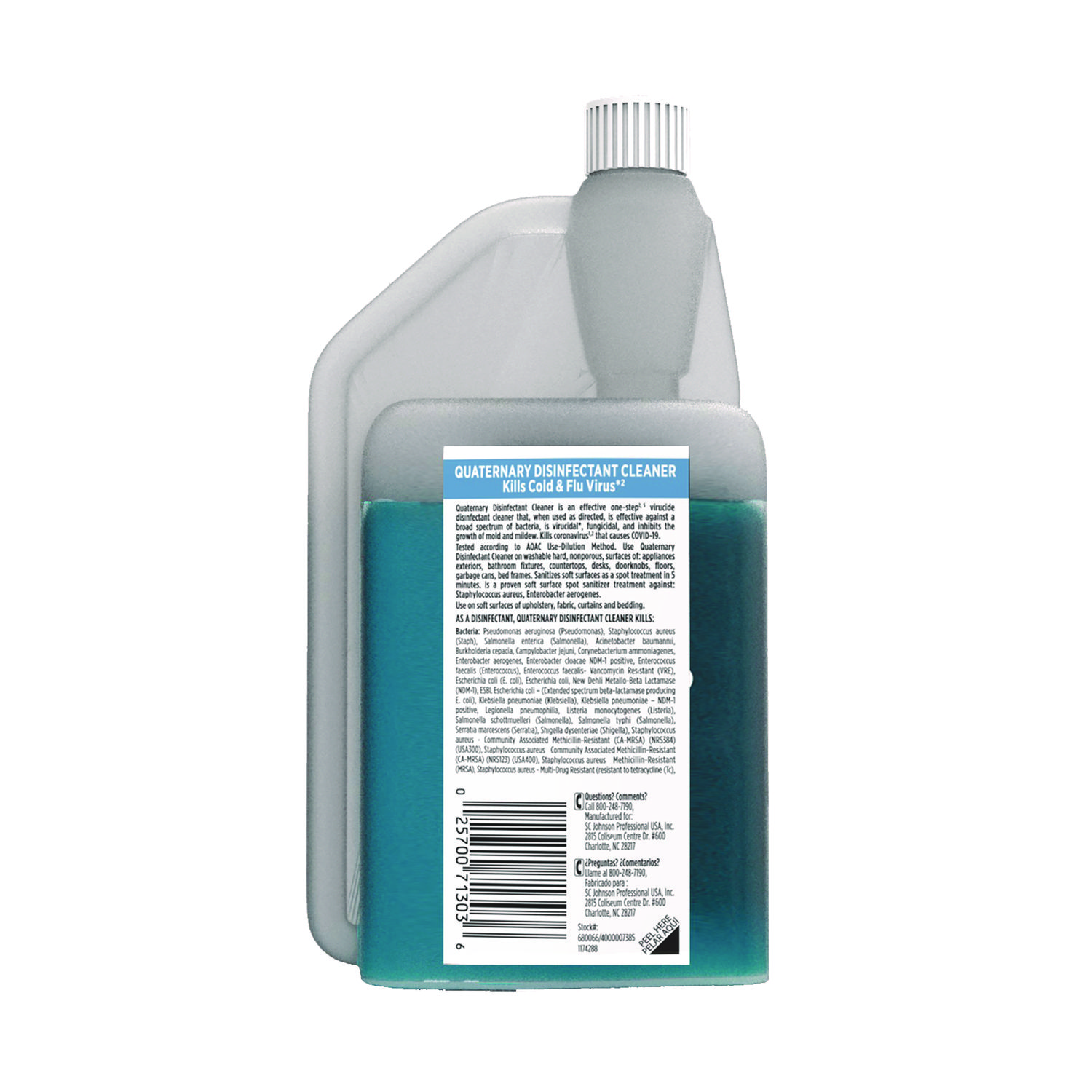 Effective one-step virucide disinfectant cleaner that, when used as directed, is effective against a broad spectrum of bacteria, is virucidal, fungicidal, and inhibits the growth of mold and mildew. Tested according to AOAC Use-Dilution Method. Concentrate. Application: Disinfectant/Cleaner; Applicable Material: Hard Floor Surfaces; Chemical Compound: Dicapryl/Dicaprylyl Dimonium Chloride; Benzalkonium Chloride Water; Dirt Types: Dirt; Germs.