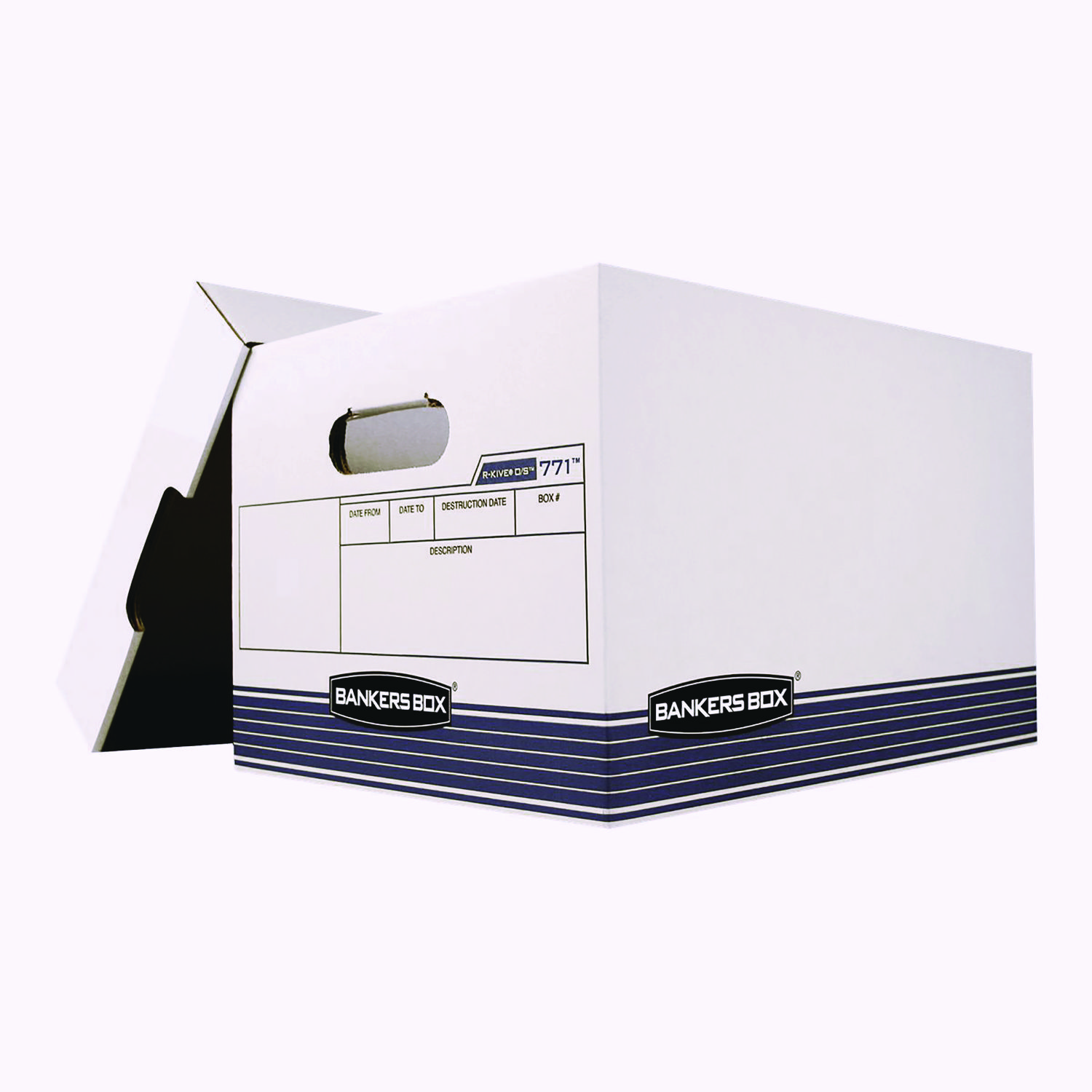 Heavy-duty, triple-end, double-side, double-bottom construction stacks up stronger and withstands frequent handling. FastFold® quick and easy assembly. Reinforced tear-resistant handles make box comfortable to carry. Deep, locking, lift-off lid stays in place for secure file storage. Smooth rolled edges add strength and prevent paper cuts. Box Type: Stackable File Storage; Box Style: FastFold® Quick & Easy Assembly; Strength: Heavy-Duty; File Size Format: Letter/Legal.