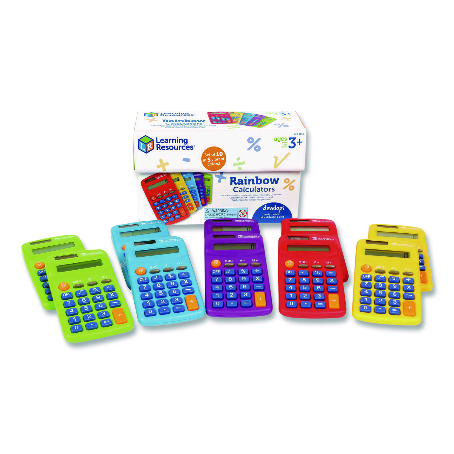Make math colorful! Solve equations straight from the end of the rainbow with Rainbow Calculators from Learning Resources. A fun colorful twist on our popular Primary Calculators, each set Rainbow Calculators comes with five vibrant colors—red, green, blue, orange or purple. There’s one for every day of the school week! Add some color to your elementary math classes or brighten up the evening’s homework! Although the colors may be whimsical, the Rainbow Calculators do serious work: use these four-function calculators to check addition, subtraction, multiplication and division equations on the eight-digit display, or discover more advanced calculations like square roots, percentages and more! Simple to use for beginners and powerful enough for older students, our Rainbow Calculators grow along with your skills. Each Rainbow Calculator operates with both solar and battery power, and also includes features such as auto shut-off, three-key memory and more. Perfect for teacher resources and school stores! Power Source(s): Battery; Solar; Display Notation: Numeric; Number of Display Digits: 8; Calculators Display Type: LCD.