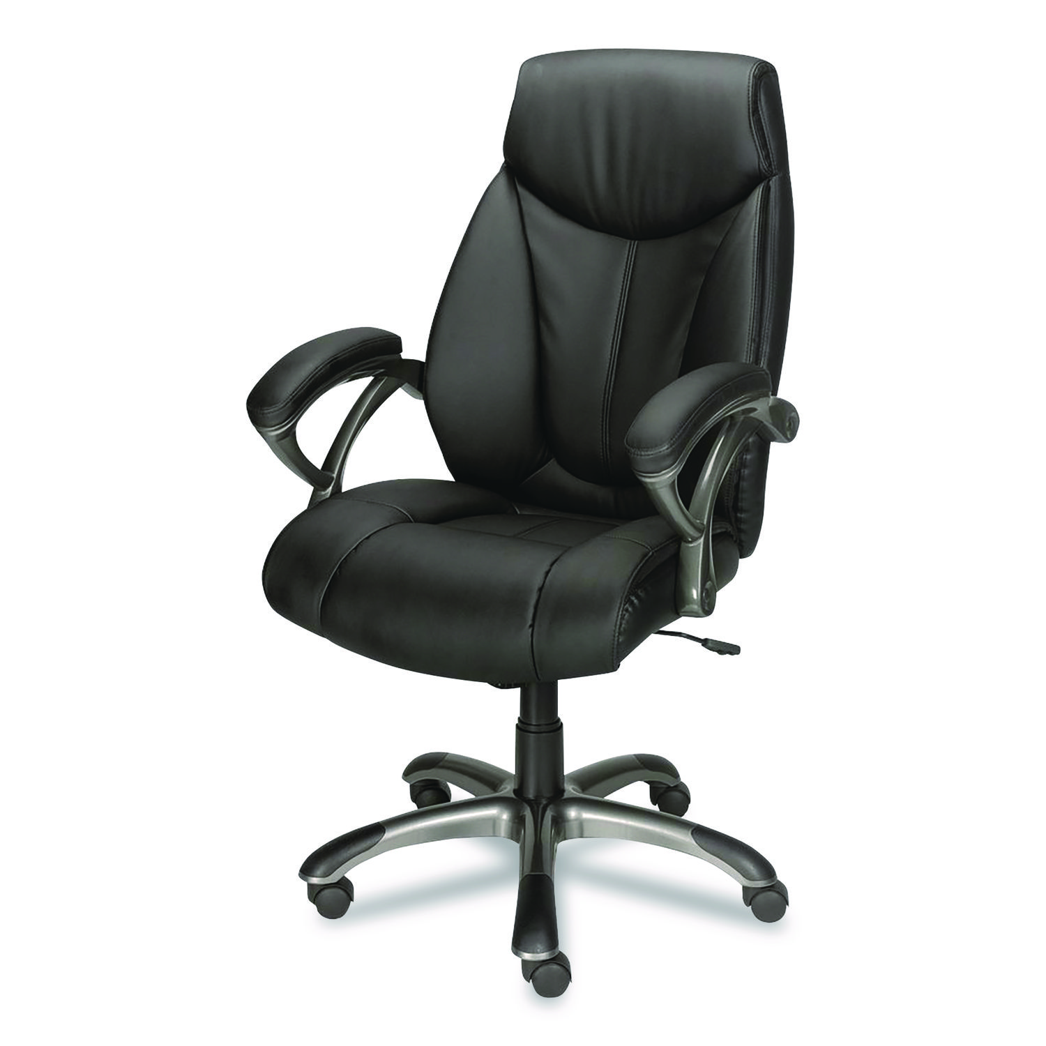 Enjoy all-day ergonomic comfort with this Workplace2.0™ Ramsey Bonded Leather high-back manager’s chair with built-in lumbar support. Made to prevent lower back pain and fatigue, this premium bonded leather office chair is an ideal upgrade for both comfort and style. The Workplace2.0™ Ramsey Bonded Leather high-back manager’s chair features a padded back, seat cushion and armrest for a relaxing feel plus adjustable seat height and back tilt to fit your preferences. Great for a variety of body types, this sturdy ergonomic desk chair has a large, cushioned seat and sturdy base. With durable bonded leather upholstery, this premium chair will add lasting comfort and style to your home or office. Recommended Application Area(s): Executive & Management; General Office & Task; Seat Color: Black; Back Color: Black; Color Family: Black.