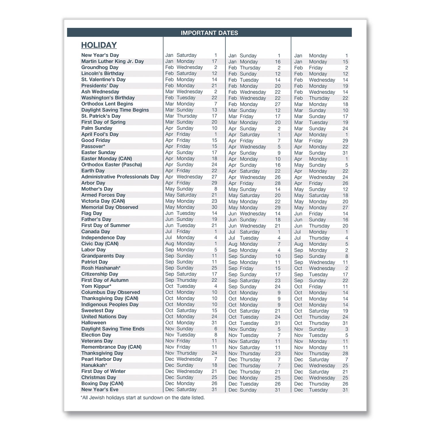 | Calendar Spread Format: | One Month per Two-Page Spread |