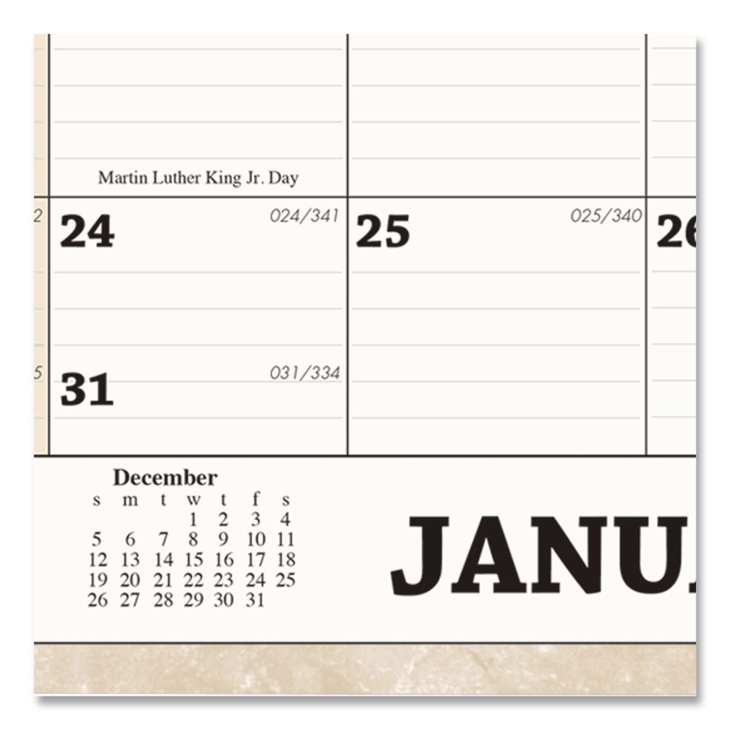 Marbleized background with neutral cream and tan graphics matches any decor. Lightly ruled daily blocks help keep notations neat. Shaded weekends help the workweek stand out. Each week is numbered, and Julian dates/days remaining give you a snapshot of where you are throughout the year. Each spread includes a four-month reference calendar at the bottom of the page, showing two previous and two future months. Made entirely of recycled materials. Dated: Yes; Academic Year: No; Calendar Format: Monthly; Calendar Spread Format: One Month per Page.