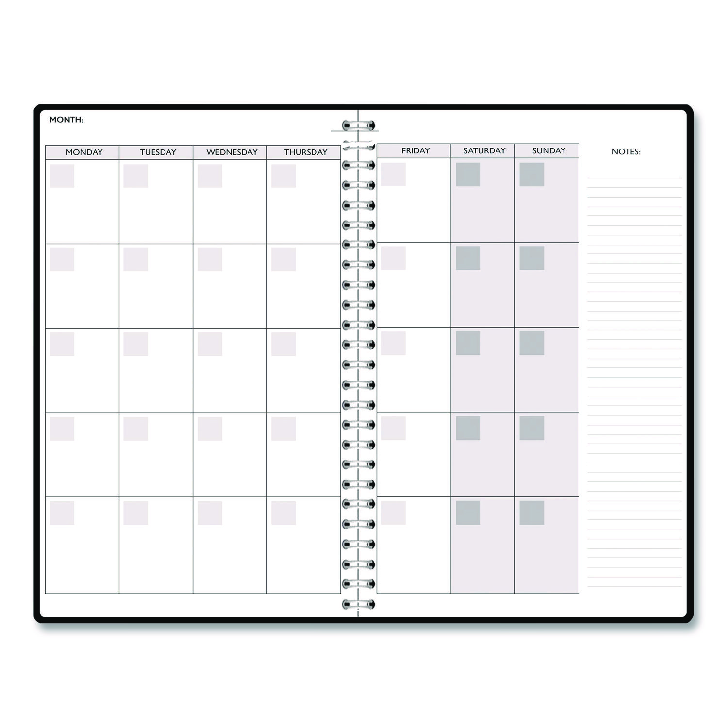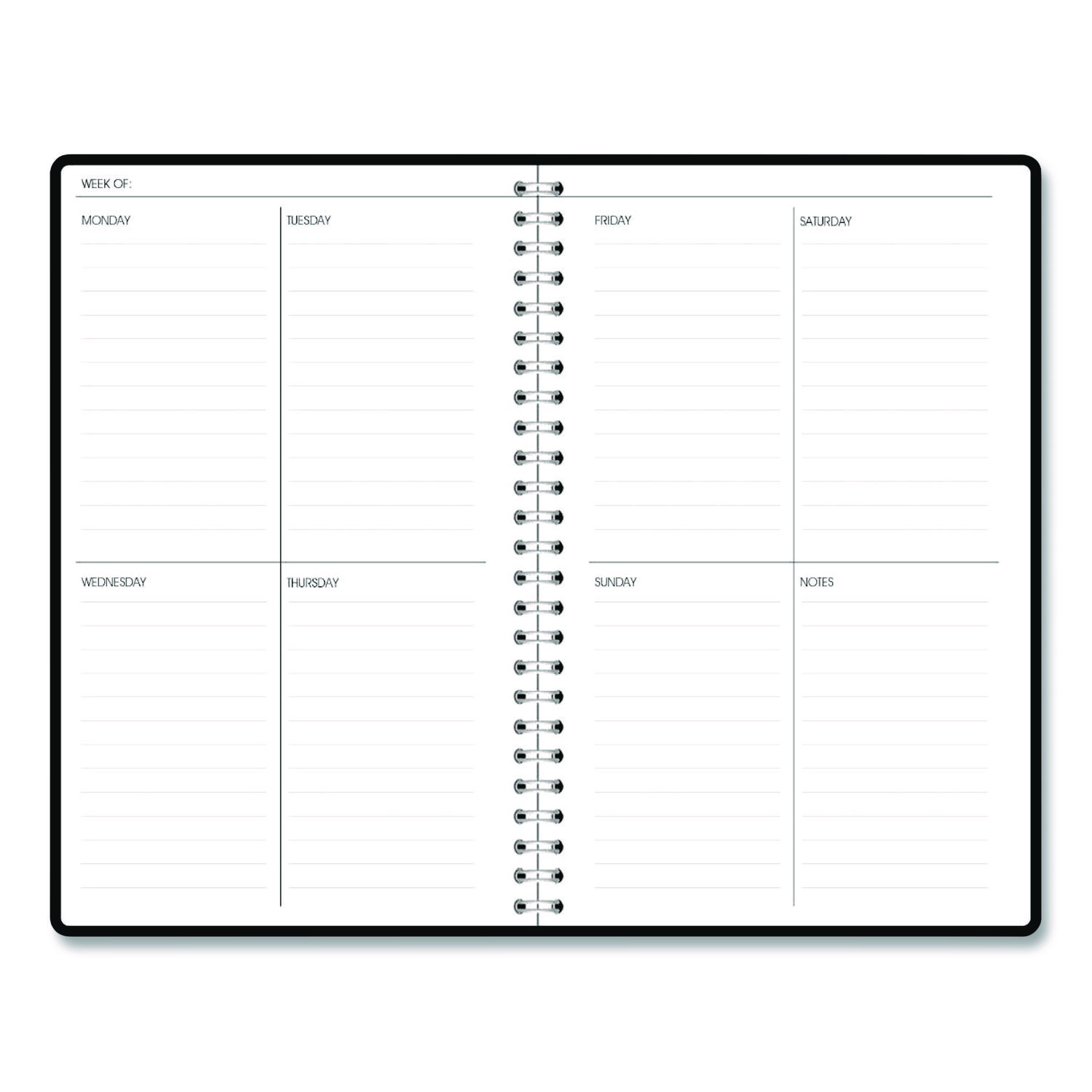 | Calendar Spread Format: | One Week per Two-Page Spread; One Month per Two-Page Spread |