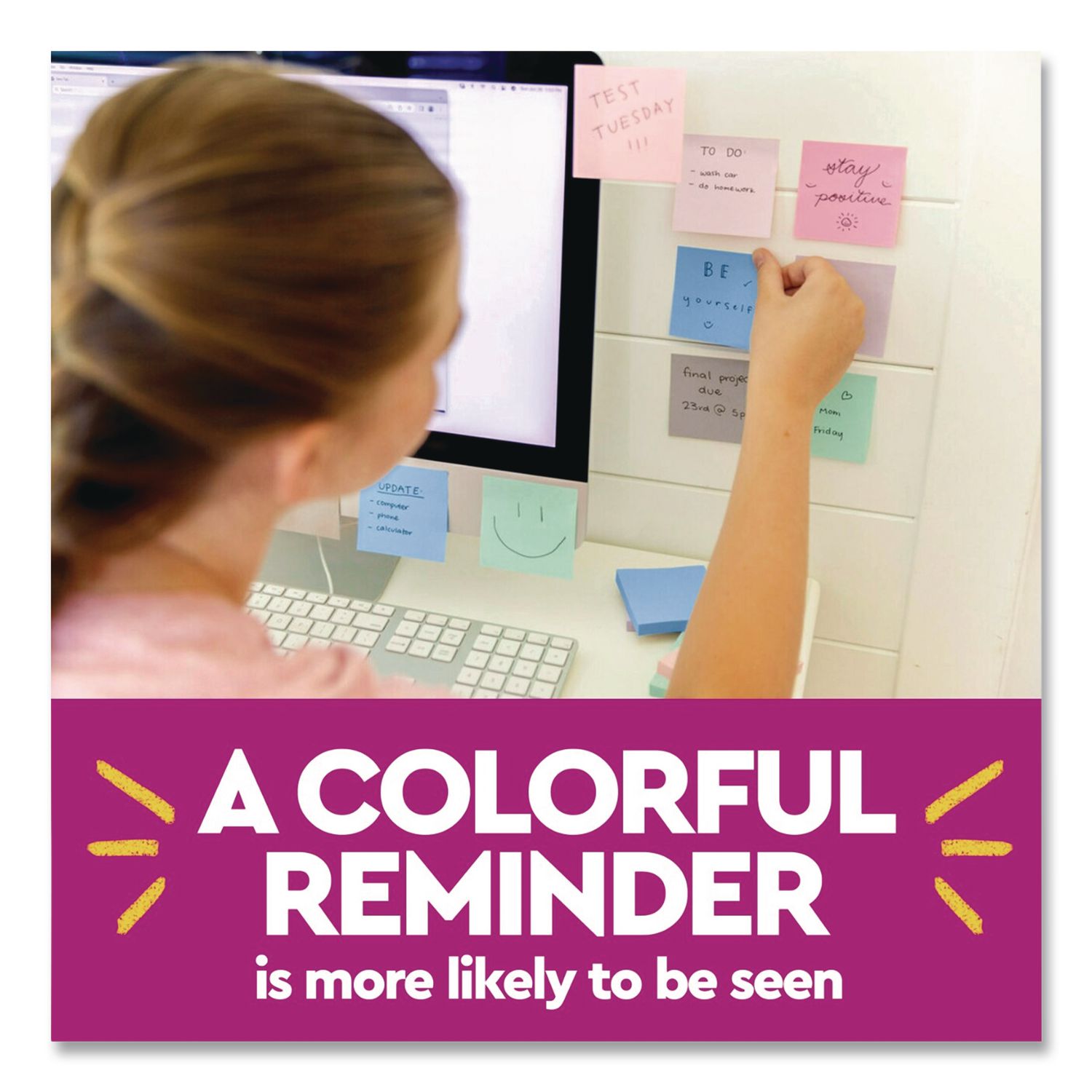 Cut through the clutter with the Wanderlust Color Collection. Whether jotting down your daily to-do’s, brainstorming, taking notes or setting reminders, colors and ideas are always brighter together. Featuring twice the sticking power of standard Post-it® Notes, Super Sticky notes stick and re-stick, again and again, so your thoughts get noticed regardless of how many times you might need to move them. All Post-it® Recycled Paper Super Sticky Notes and their packaging are 100% curbside recyclable. Cabinet Pack—Includes 18 pads in a convenient tray to help you keep your supplies neat and organized. Self-Stick Pad Type: Super-Sticky Pop-Up; Shape: Square; Color(s): Wanderlust Pastels Collection; Color Family: Multicolor.