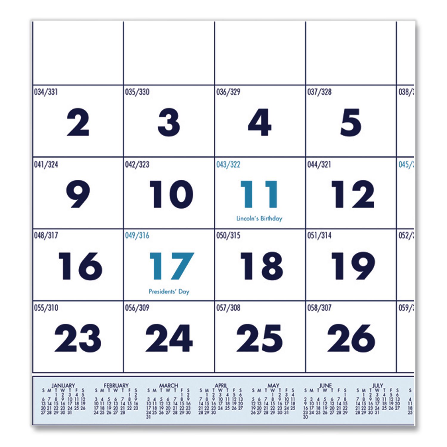 See three months at a time. Wall calendar details the prior, present and following month on each page. Large date numerals with holidays highlighted. Strong wire-binding firmly keeps the pages together and in place. Features a full, 12-month reference calendar for long-term planning. Sturdy wire hanger makes it easy to hang the calendar on the wall. Made entirely of recycled materials. Vertical Orientation. Dated: Yes; Academic Year: No; Calendar Format: Quarterly; Calendar Spread Format: Vertical: One Quarter per Page.