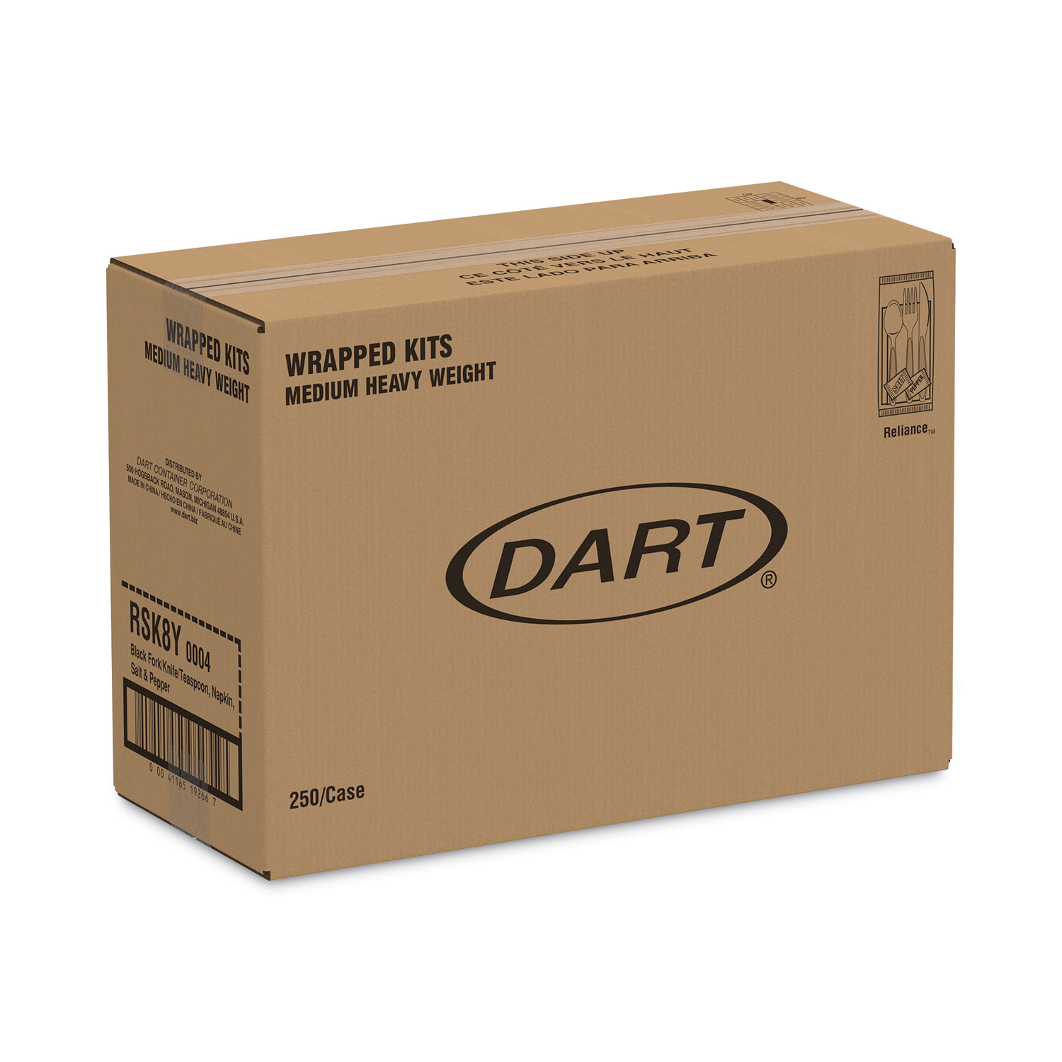 Reliance Mediumweight Cutlery Kit, Fork/Knife/Napkin/Pepper/Salt/Spoon, Plastic, Black, 250/Carton