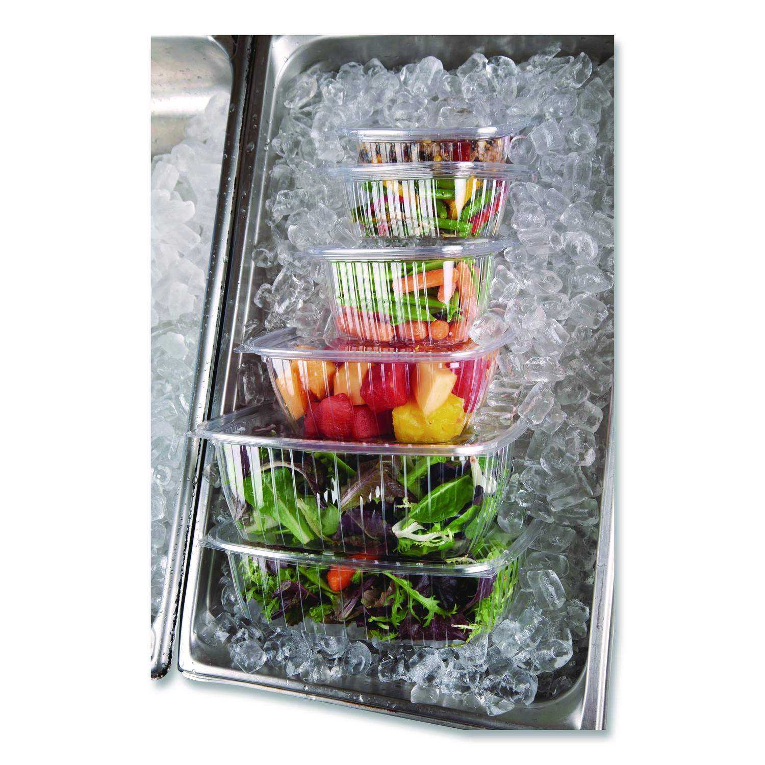 These plant-based alternatives make your food look great. Send back the waste that comes with old school containers and reach for something different. Renewable and compostable PLA is just as clear as your mom’s plastic, so you’ve got a great option for your Grab ‘n Go needs. Remember though, PLA only works for cold foods, so think recycled content if the goods are hot! Made with PLA, a plant-based renewable resource type of plastic and meet ASTM standards for composability. Being clear, they’re great for displaying cold your favorite cold foods. Engineered for strength and stackability. Lids included. Food Container Type: Base/Lid Combo; Material(s): PLA; Material Type: Plastic; Interior Volume Capacity: 24 oz.
