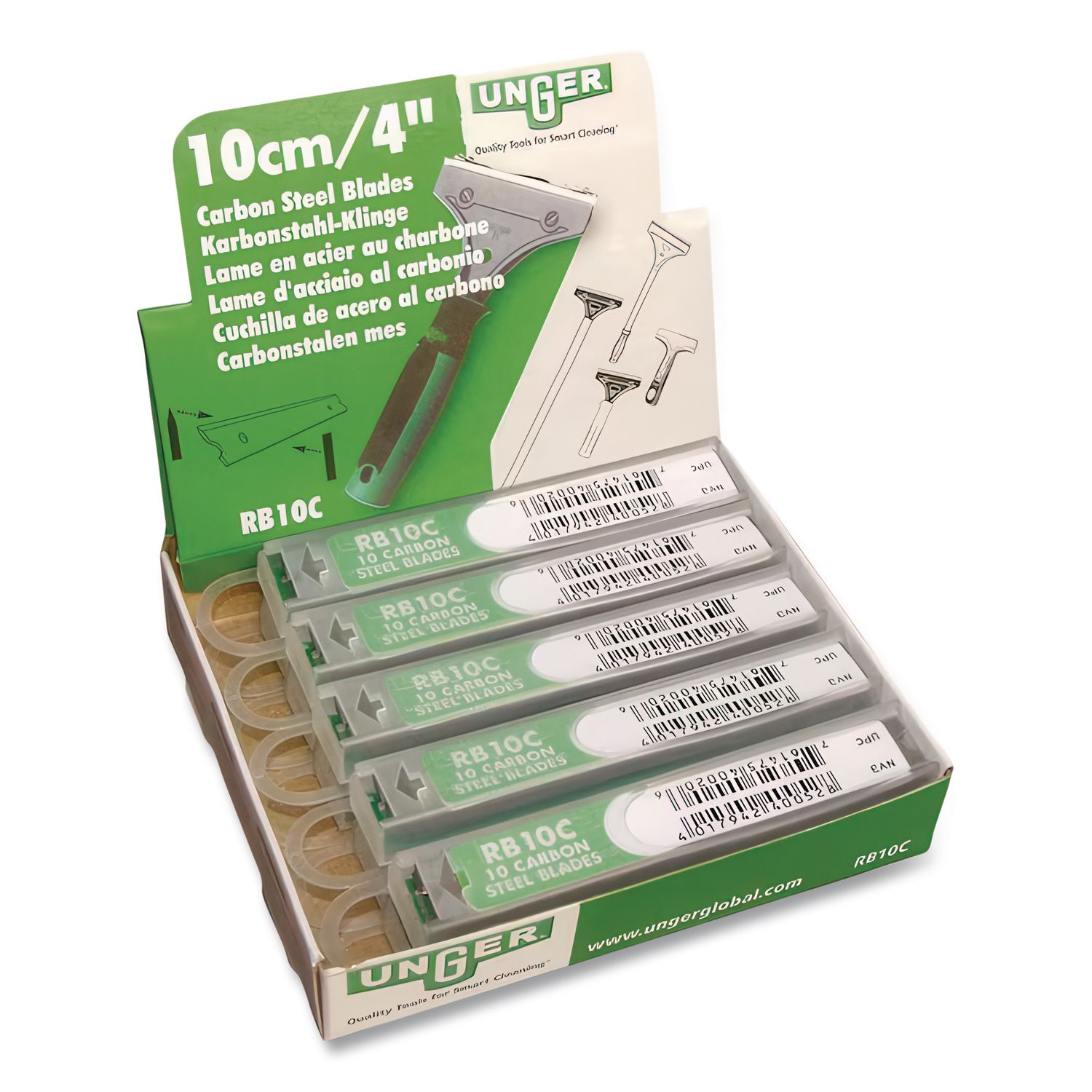 Replacement blade for Unger® heavy-duty scraper. Dual sided. Razor-sharp edge eliminates the need for strenuous scraping on all hard surface floors; blunt edge works on delicate, uneven floors. Blade Type: Reversible; Material(s): Carbon Steel; Blade Width: 8″; Color(s): Steel.