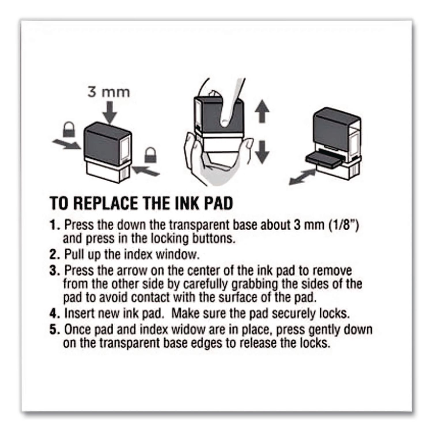 Changing ink pads is easy with this snap in, snap out cartridge style. Delivers up to 5,000 impressions. Stamp Pads Type: Inked Replacement; Ink Pad Type: Cartridge; Refill(s) For: 2000 PLUS® 1SI10P; Ink Color(s): Black.