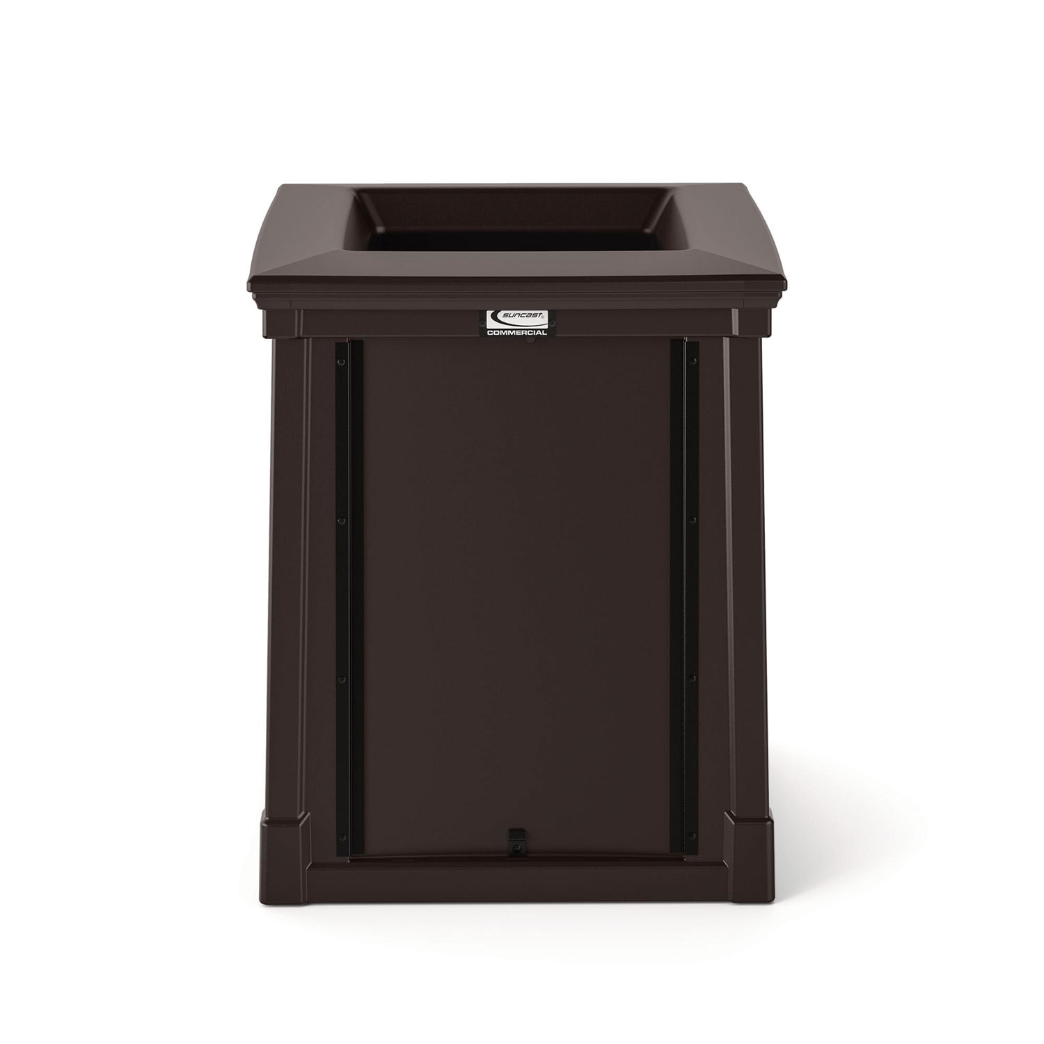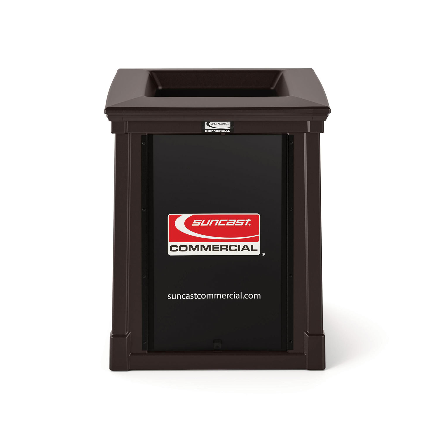 This convenience store style trash can by Suncast Commercial boasts an eye-catching and sturdy look that allows it to complement any entranceway, outdoor space, shopping center or commercial property. A piano hinge and tethers let the lid flip open for liner replacement while keeping the lid from falling off. The large opening of the can provide patrons with a way to deposit trash from any side of the can, perfect for high-traffic areas. With the slide-in railing system for sign advertisements on three sides, this is the perfect can to advertise businesses, promotions or sports teams. Roto-molded frame with one-piece base for strength and longevity. Base allows for concrete anchors to be used to secure the can to the ground. Drain holes to release water. Will not rust or chip and is resistant to denting and bending. Waste Receptacle Type: Outdoor All-Purpose Waste Bin; Material(s): Plastic; Application: Outdoor All-Purpose Waste Disposal; Interior Volume Capacity: 34.4 gal.