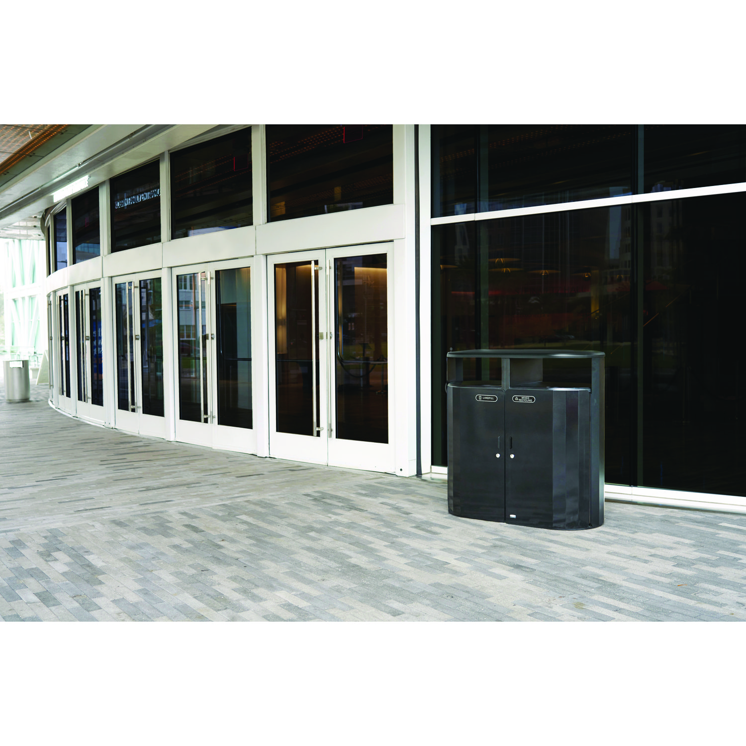 The Resist Dual Stream Trash and Recycling Container is designed to maintain high-quality aesthetics under the most extreme outdoor conditions. Proprietary fan design resists up to 500 lbs of sustained blunt force. An advanced coating defends surfaces from graffiti and everyday stains. Special coating helps resist rust, corrosion and fading. The permanent rain hood prevents unwanted environmental debris from entering the container. Waste Receptacle Type: Outdoor All-Purpose Waste Bin; Material(s): Metal; Application: Outdoor Waste Disposal; Interior Volume Capacity: 66 gal.