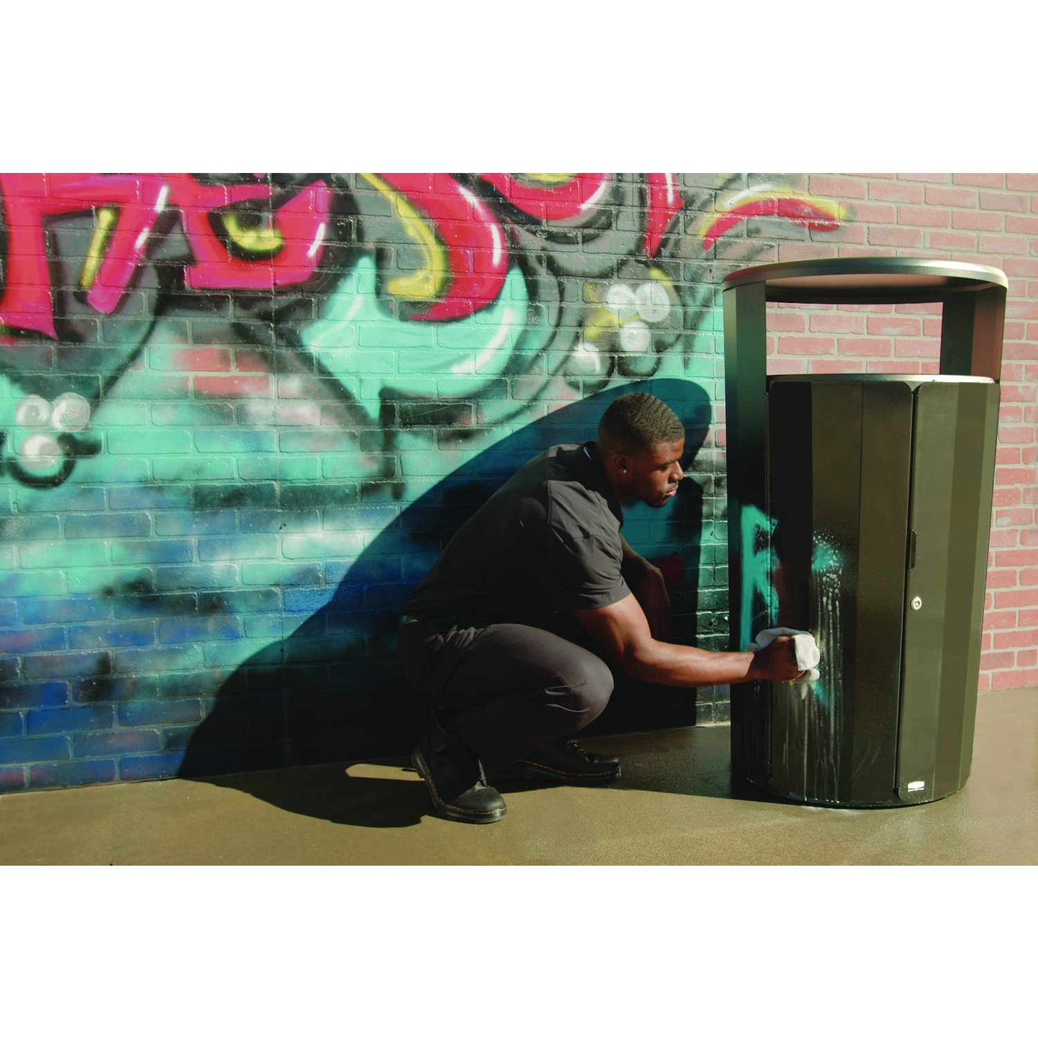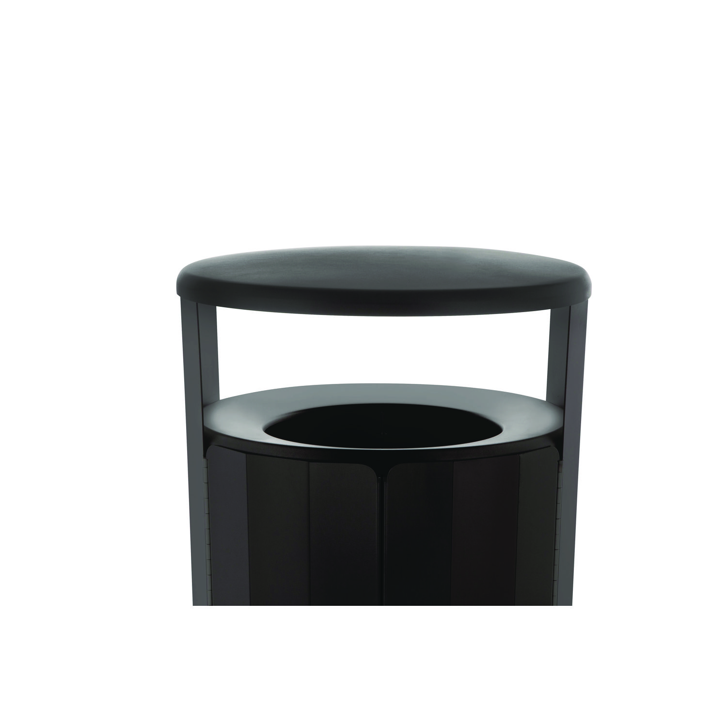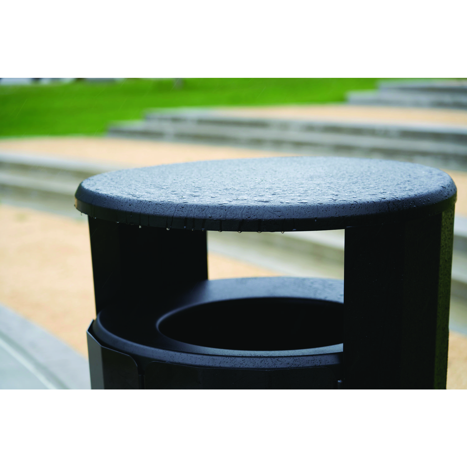 The Resist Round Waste Container is designed to maintain high-quality aesthetics under the most extreme outdoor conditions. Proprietary fan design resists up to 500 lbs of sustained blunt force. An advanced coating defends surfaces from graffiti and everyday stains. Special coating helps resist rust, corrosion and fading. The permanent rain hood prevents unwanted environmental debris from entering the container. Waste Receptacle Type: Outdoor All-Purpose Waste Bin; Material(s): Metal; Application: Outdoor Waste Disposal; Interior Volume Capacity: 45 gal.